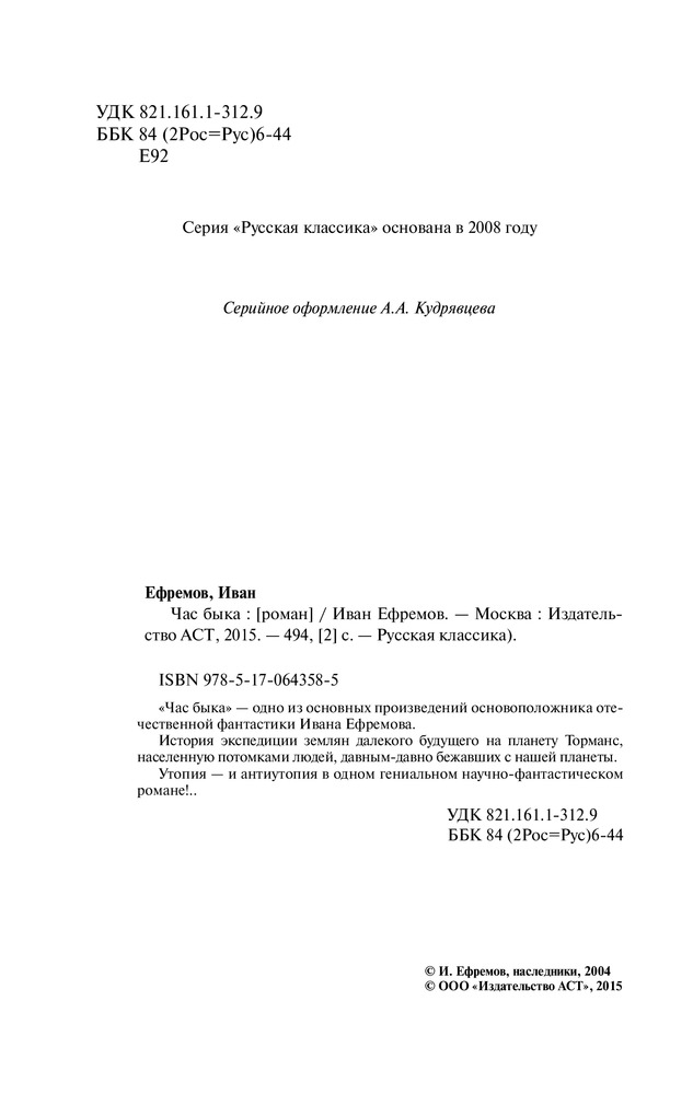 Час быкаВ данный момент этот товар отсутствует в продаже. Возможно, у нас найдется аналогичный или похожий товар здесь. Серия: Русская классика «Час Быка» — одно из основных произведений основоположника отечественной фантастики Ивана Ефремова. История экспедиции землян далекого будущего на планету Торманс, населенную потомками людей, |