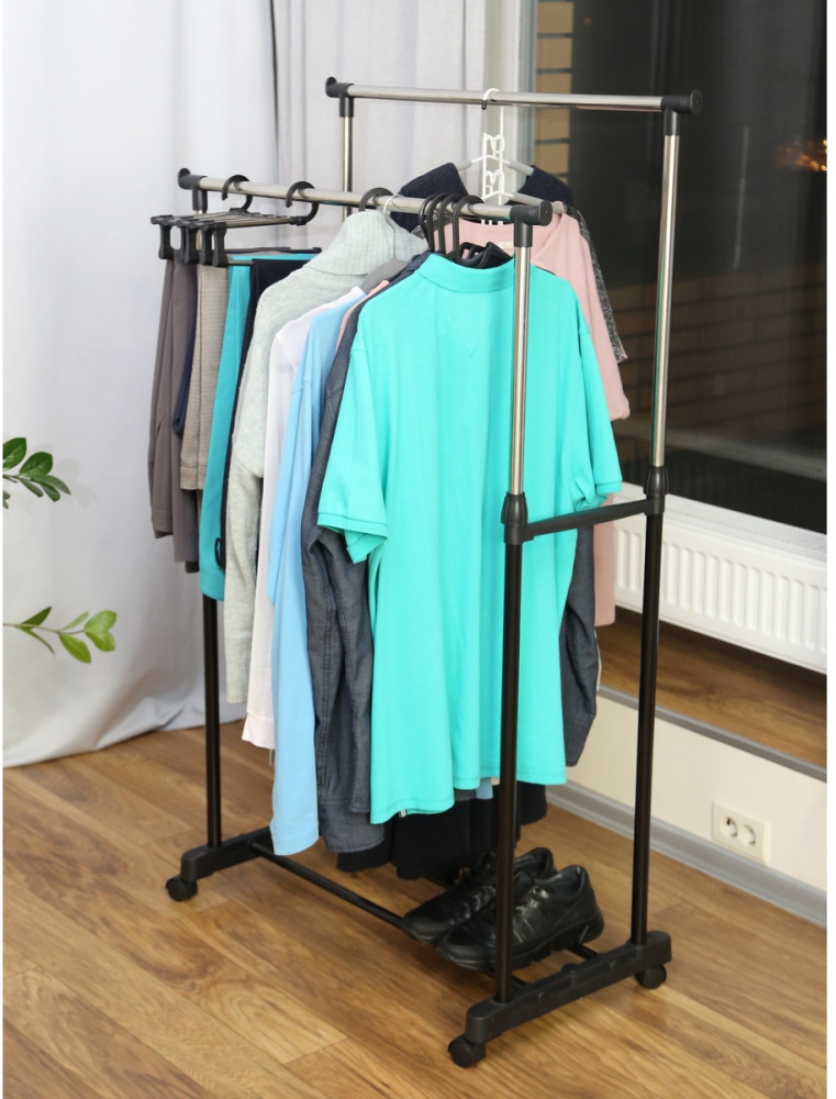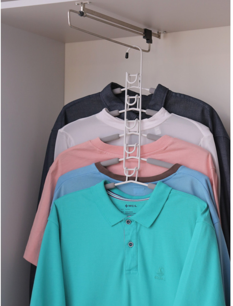Удобно выбирать, что надеть, каждые плечики снимаются отдельно, одежда висит компактно. Идеальна для футболок, поло, блузок, рубашек.