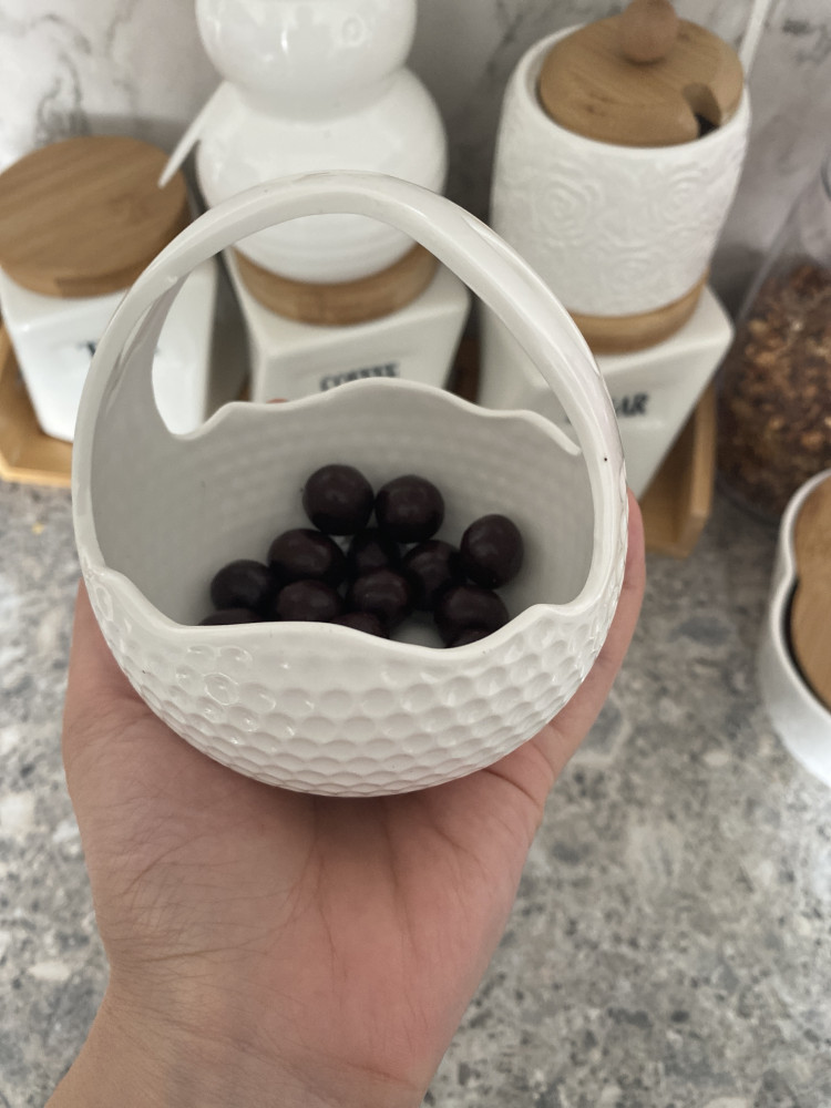 Очень маленькая, прям малышка в ладошки помещается, заказала не посмотрев на размеры, моя вина . можно положить м&м или шоколадные шарики с арахисом