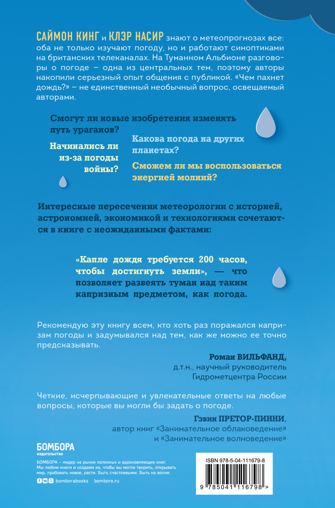 💳 Оплатить за товар можно при получении 🇰🇿 Есть бесплатная доставка по Казахстану от 1 дня 🎁 Копите бонусы с каждой покупки Серия: Кругозор Дениса Пескова Чем пахнет дождь? А если это дождь из рыб или лягушек? А можно ли искусственно вызвать дождь? Саймон Кинг и Клэр Насир знают о погоде все — и спешат поделиться с читателями интересными историями о дожде и снеге, ветрах и облаках, об удивительной радуге и о внушающих ужас смерчах и торнадо. Книга расскажет все о климате на Земле и в космосе и сделает привычные разговоры о погоде по-настоящему увлекательными и интересными. |
