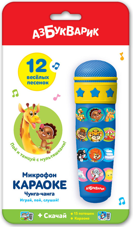 Азбукварик Микрофон-караоке «Чунга-чанга»В данный момент этот товар отсутствует в продаже. Возможно, у нас найдется аналогичный или похожий товар здесь. Серия: Микрофон Новые оригинальные микрофоны-караоке для будущих звезд сцены! В этом микрофоне собрано 12 популярных песенок известных композиторов: «Чунга-чанга», «Танец маленьких утят», «Песенка о жирафе», «Танцуй-танцуй», «Наш весёлый шумный дом», «Весёлая карусель», «Что вы знаете про льва», «Котёнок-веселушка», «Что такое лето?», «Забавные противоположности», «Лошадкина зарядка», «Хорошее настроение». |
