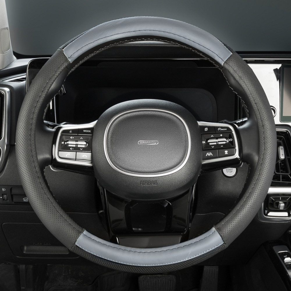 Оплетка Skyway Real-9 — оплётка из натуральной кожи обеспечивает защиту рулевого колеса и сохраняет привлекательный внешний вид в течение длительного времени. Скроет потёртости и царапины, предохранит от появления новых. Натуральная кожа приятна на ощупь даже при низких температурах, остается мягкой, податливой, не раскаляется от солнечных лучей. Прекрасное украшение для любого салона. Перфорация улучшает сцепление рук с рулём исключая их опасное скольжение. Внутренняя сторона оплётки имеет резиновую основу, которая исключает проскальзывание оплетки по рулевому колесу.