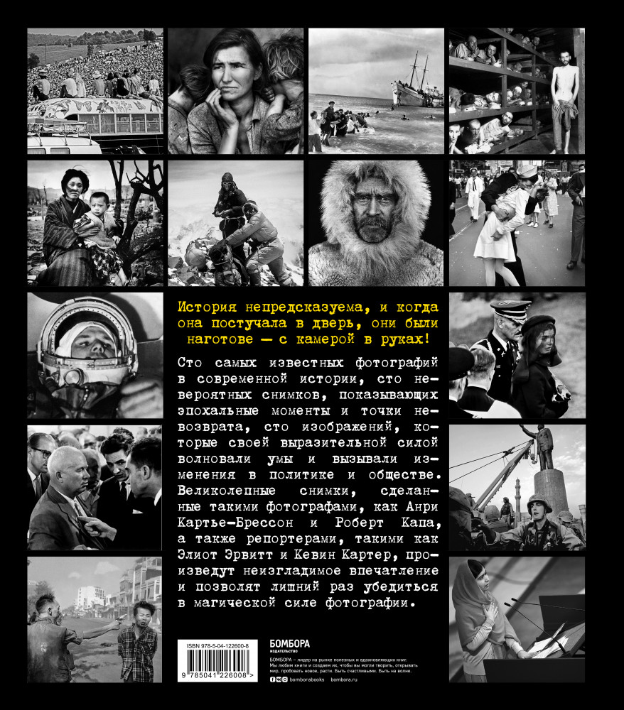 Легендарные фотографии, изменившие мирМаргарита Джакоза, Роберто Моттаделли, Джанни Морелли В данный момент этот товар отсутствует в продаже. Возможно, у нас найдется аналогичный или похожий товар здесь. Серия: Фотография как искусство 150 лет истории на 100 легендарных фотографиях! От открытия гробницы Тутанхамона до первого полета на самолете братьев Райт, от грибовидного облака в Нагасаки до первой высадки на Луну — эти 100 фотографий запечатлели некоторые из самых знаковых моментов в истории. Они напоминают нам, что фотография не только ведет хронику крупных событий по всему миру, но также служит средством повышения осведомленности и изменения общественного мнения. |