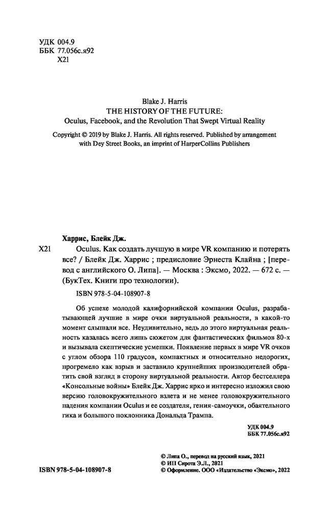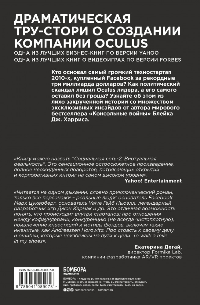 Автор бестселлера «Консольные войны» Блейк Дж. Харрис ярко и интересно изложил свою версию головокружительного взлета и не менее головокружительного падения компании Oculus и ее создателя, гения-самоучки, обаятельного гика и большого поклонника Дональда Трампа. |