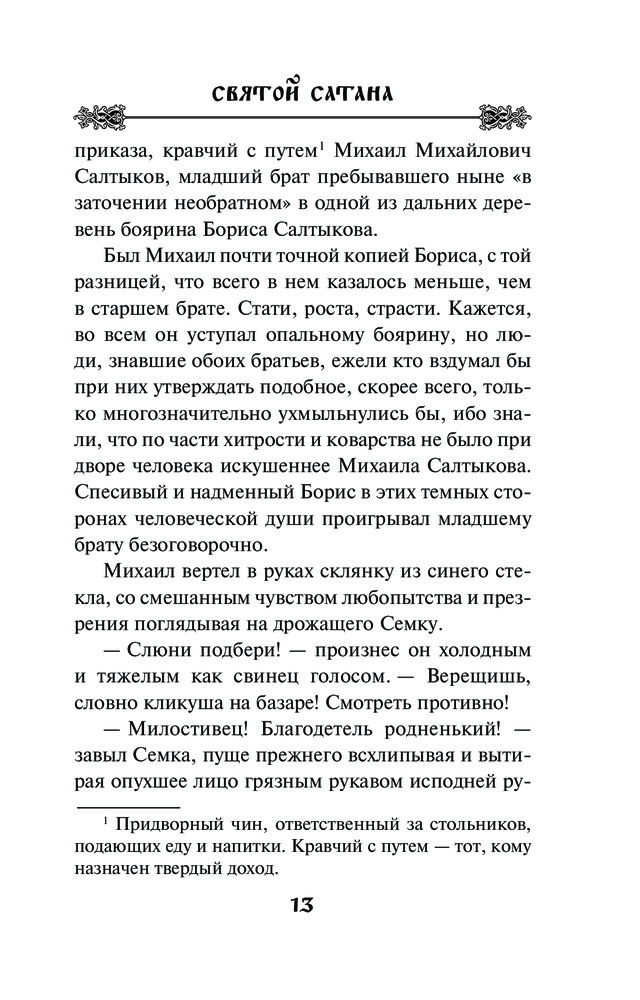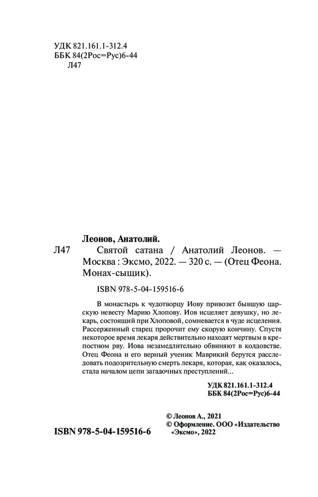 Святой сатанаВ данный момент этот товар отсутствует в продаже. Возможно, у нас найдется аналогичный или похожий товар здесь. Серия: Отец Феона. Монах-сыщик (обложка) В монастырь к чудотворцу Иову привозят бывшую царскую невесту Марию Хлопову. Иов исцеляет девушку, но лекарь, состоящий при Хлоповой, сомневается в чуде исцеления. Рассерженный старец пророчит ему скорую кончину. Спустя некоторое время лекаря действительно находят мертвым в крепостном рву. Иова незамедлительно обвиняют в колдовстве. Отец Феона и его верный ученик Маврикий берутся расследовать подозрительную смерть лекаря, которая, как оказалось, стала началом цепи загадочных преступлений... |