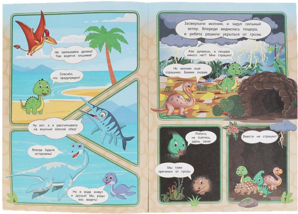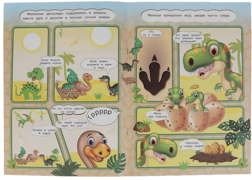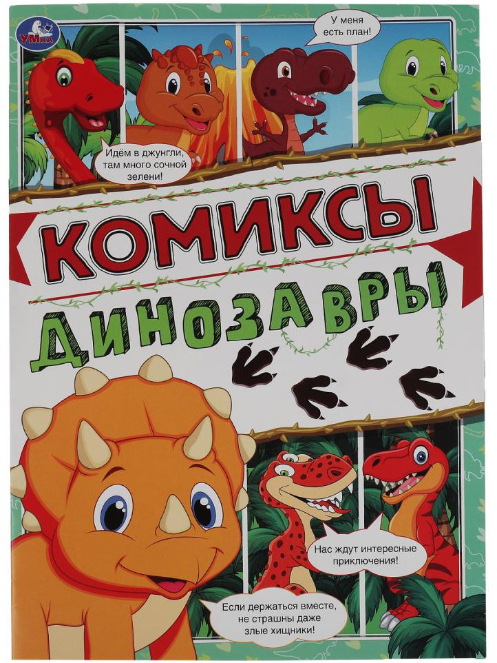 Эти увлекательные комиксы, состоящие практически из одних картинок с минимальным количеством текста, приглашают детей окунуться в удивительный мир, где живут милые и забавные динозавры. Такой формат непременно заинтересует ребёнка, он с удовольствием будет читать необыкновенную историю, оформленную яркими иллюстрациями с изображением очаровательных персонажей.