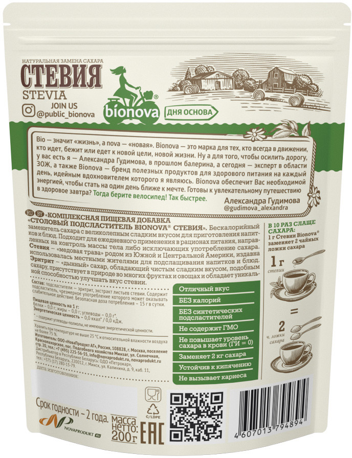 Bionova Подсластитель столовый «Стевия»высокая сладость замена сахара отсутствие запаха специфичный привкус неэкономичен В данный момент этот товар отсутствует в продаже. Возможно, у нас найдется аналогичный или похожий товар здесь. Стевия в порошке — бескалорийный натуральный заменитель сахара с великолепным сладким вкусом для приготовления напитков и блюд. Подходит для ежедневного применения в рационах питания, направленных на контроль массы тела либо исключающих употребление сахара. Идеален для приготовления напитков и блюд. |