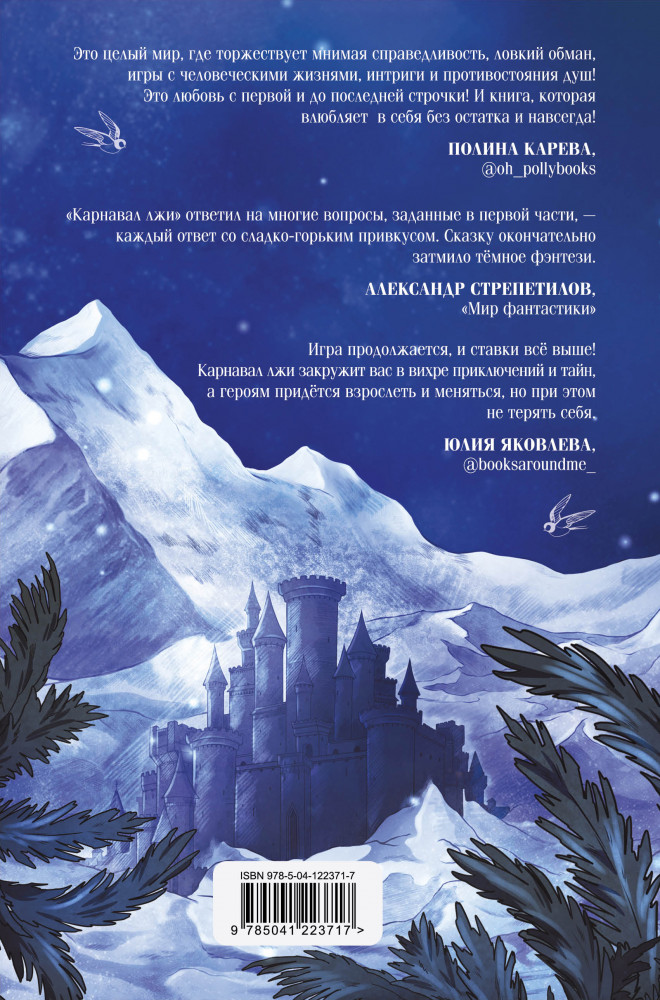 Карнавал лжиидеальное состояние красивая обложка карта внутри стиль письма В данный момент этот товар отсутствует в продаже. Возможно, у нас найдется аналогичный или похожий товар здесь. Серия: Охотники за мирами. Темные игры Лиара Полгода. Всего полгода спокойной жизни — столько Таше уготовила судьба. Тёмные игры Лиара продолжаются, и пришло время сделать следующий ход. Первый этап игры, перевернувшей Ташину жизнь, завершён. Настала пора для нового. Он приносит девушке княжеский титул, приглашение ко двору... и покушение на короля. Покушение, в котором несправедливо обвиняют её друзей. Таше придётся снова отправиться в путешествие, чтобы спасти близких, — только её собственная беда куда ближе, чем кажется. И теперь на кону не только свобода и счастье девушки, но и судьба всего королевства. «Карнавал лжи» — продолжение романа «Кукольная королева». |
