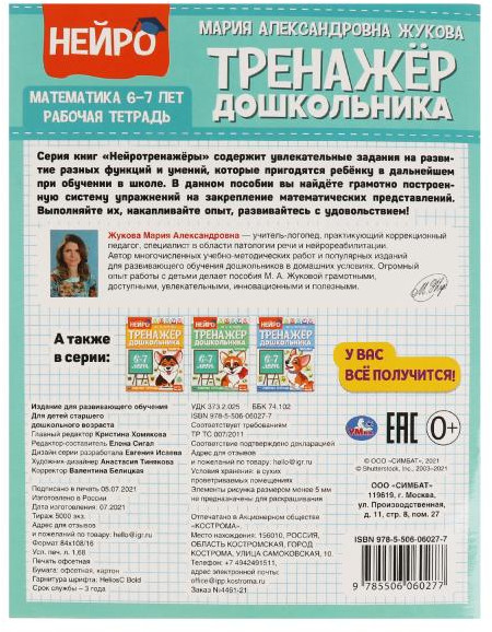 💳 Оплатить за товар можно при получении 🇰🇿 Есть бесплатная доставка по Казахстану от 1 дня 🎁 Копите бонусы с каждой покупки Серия книг «Нейротренажёры» разработана учителем-логопедом и специалистом в области патологии речи и нейрореабилитации Марией Александровной Жуковой. Рабочие тетради из этой серии содержат увлекательные задания на развитие разных функций и умений, которые пригодятся ребёнку в дальнейшем при обучении в школе. В данном пособие дошкольника ожидает грамотно построенная система упражнений на закрепление математических представлений. |