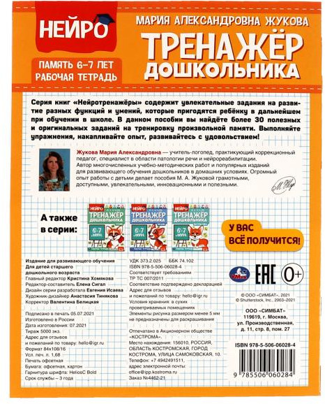 💳 Оплатить за товар можно при получении 🇰🇿 Есть бесплатная доставка по Казахстану от 1 дня 🎁 Копите бонусы с каждой покупки Серия книг «Нейротренажёры» разработана учителем-логопедом и специалистом в области патологии речи и нейрореабилитации Марией Александровной Жуковой. Рабочие тетради из этой серии содержат увлекательные задания на развитие разных функций и умений, которые пригодятся ребёнку в дальнейшем при обучении в школе. В данном пособие дошкольника ожидает грамотно построенная система упражнений по развитию памяти. |