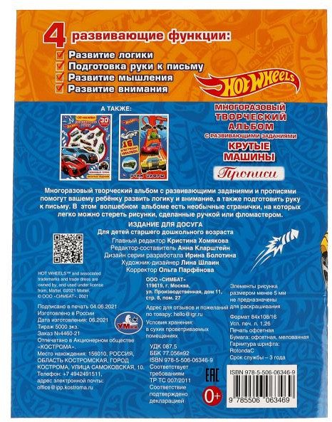 УМка Многоразовая раскраска с прописями «Hot Wheels. Крутые машины»В данный момент этот товар отсутствует в продаже. Возможно, у нас найдется аналогичный или похожий товар здесь. На страницах этой занимательной раскраски юного художника ждут разнообразные картинки с изображением любимых машинок и развивающие задания. Благодаря прописям ребёнок сможет также потренировать руку к письму. В этой волшебной раскраске есть необычные странички, на которых можно легко стереть рисунки, сделанные ручкой или фломастером. |