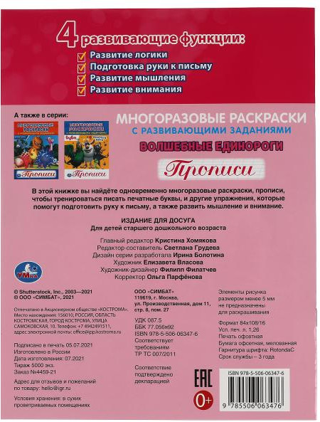 💳 Оплатить за товар можно при получении 🇰🇿 Есть бесплатная доставка по Казахстану от 1 дня 🎁 Копите бонусы с каждой покупки На страницах этой занимательной раскраски ребёнка ждут разнообразные картинки с изображением очаровательных сказочных существ и прописи для тренировки руки к письму. В этой волшебной раскраске также есть необычные странички, на которых можно легко стереть рисунки, сделанные ручкой или фломастером. |