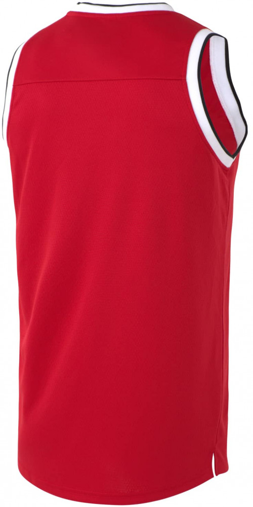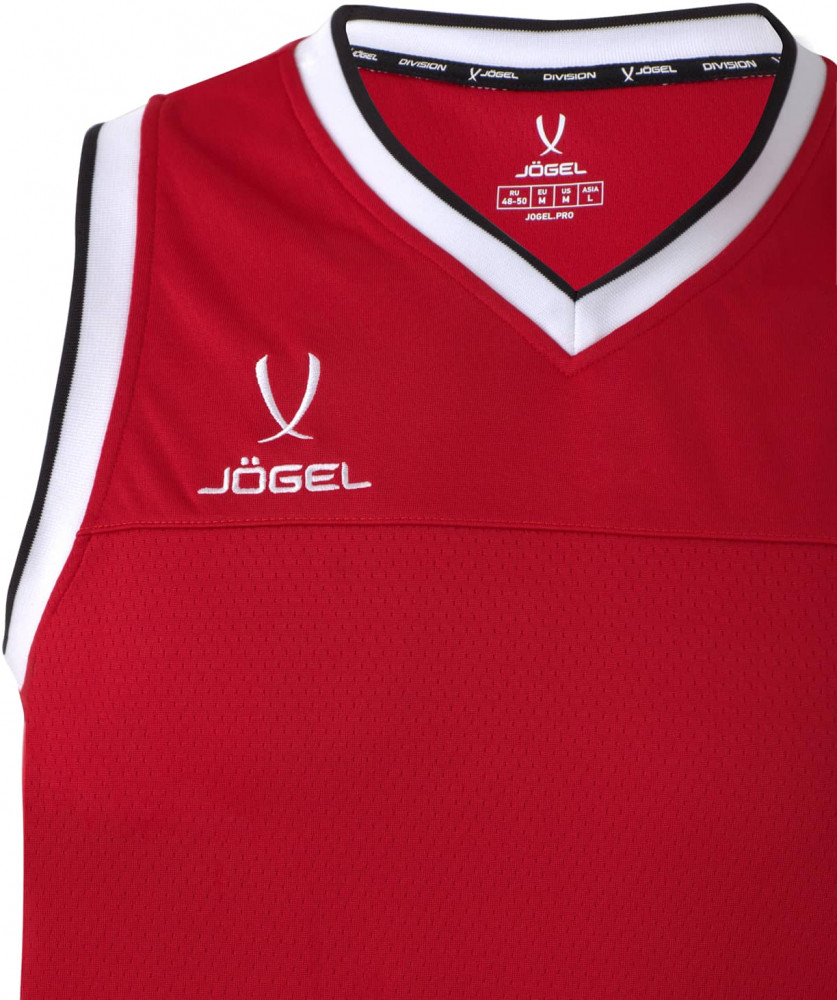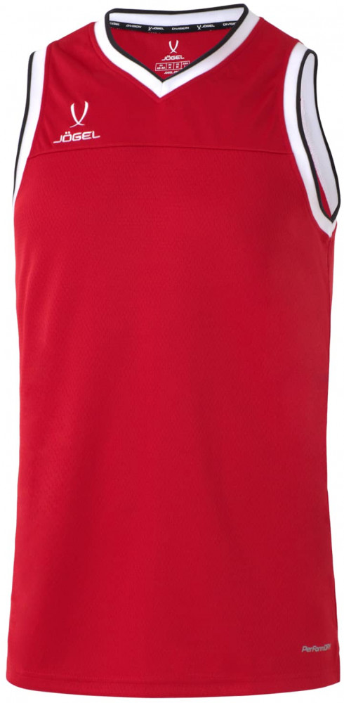 Верхняя часть майки для баскетбола имеет улучшенную вентиляцию для большего комфорта во время интенсивных нагрузок. Конструкция не ограничивает движений: баскетбольная майка имеет свободный крой; боковые швы выполнены с наклоном и оканчиваются небольшими разрезами; задняя часть изделия удлинена. С правой стороны на груди расположена вышивка «Jögel». Особенностью модели является обработка V — образной горловины и проймы контрастным рубчатым материалом с полосой, который отлично сочетается с отделкой на шортах «Jögel PerformDry Division Star».