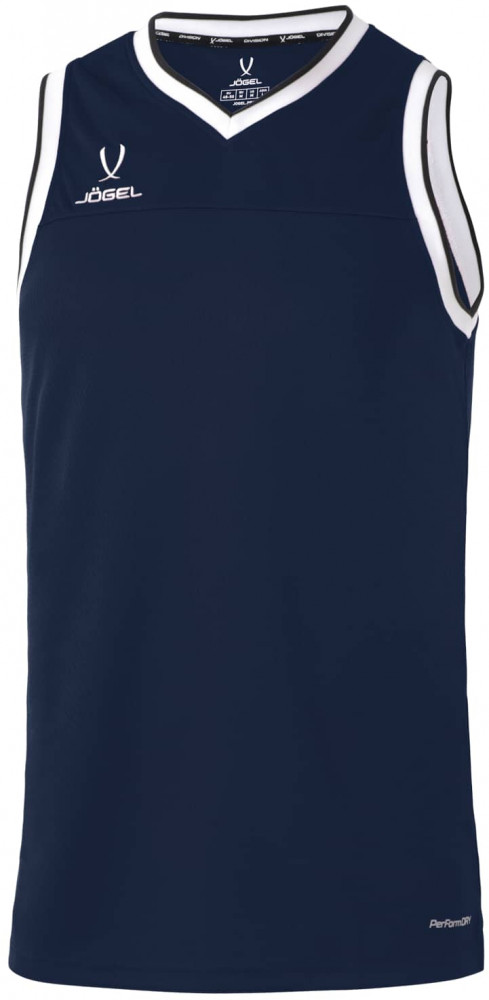 Верхняя часть майки для баскетбола имеет улучшенную вентиляцию для большего комфорта во время интенсивных нагрузок. Конструкция не ограничивает движений: баскетбольная майка имеет свободный крой; боковые швы выполнены с наклоном и оканчиваются небольшими разрезами; задняя часть изделия удлинена. С правой стороны на груди расположена вышивка «Jögel». Особенностью модели является обработка V — образной горловины и проймы контрастным рубчатым материалом с полосой, который отлично сочетается с отделкой на шортах «Jögel PerformDry Division Star».