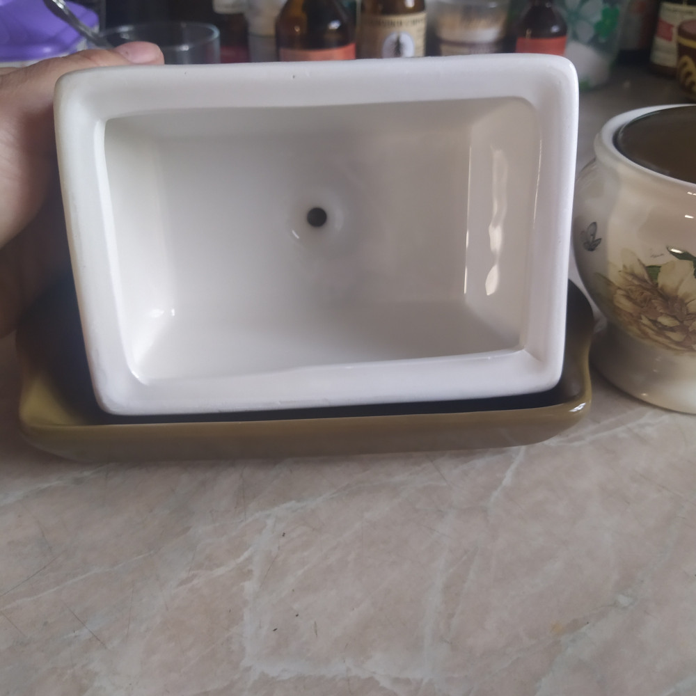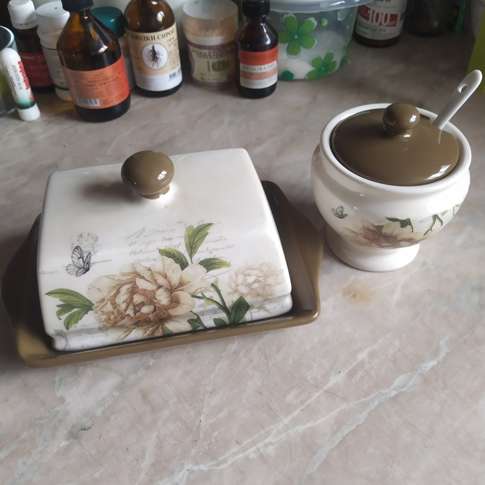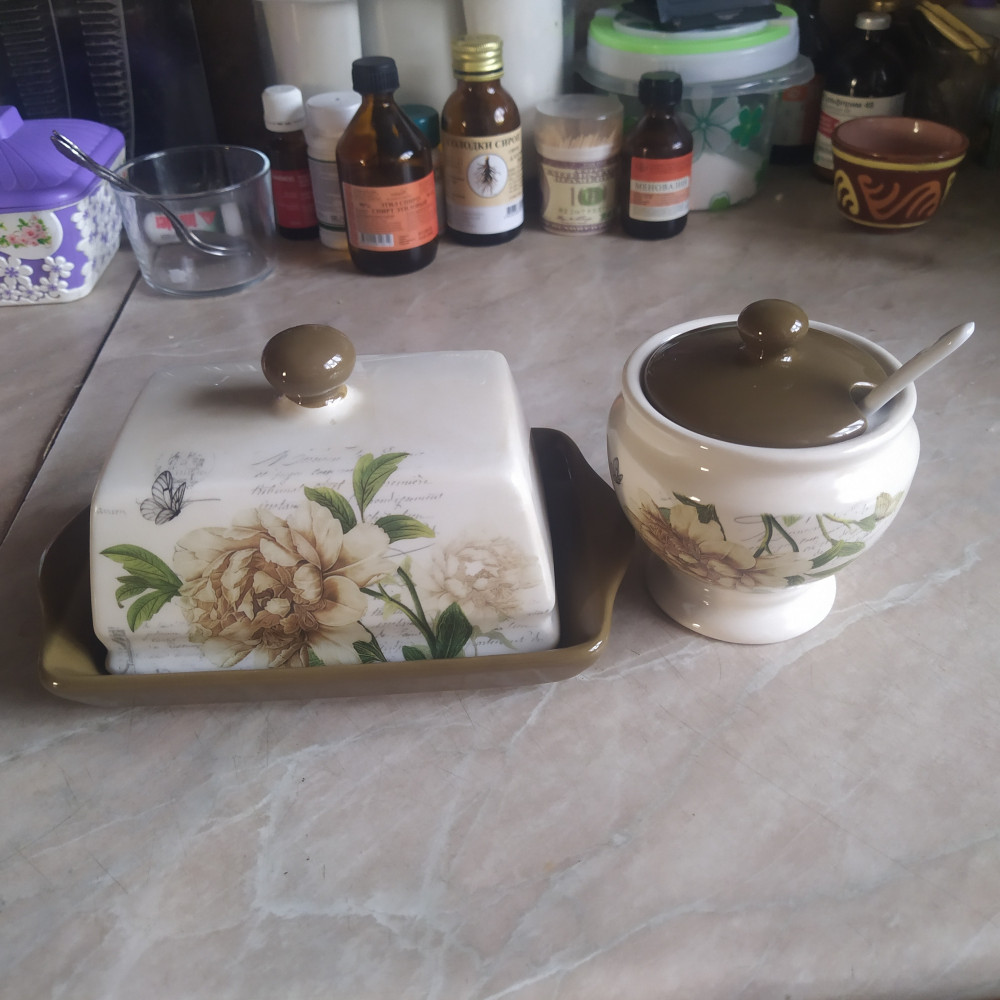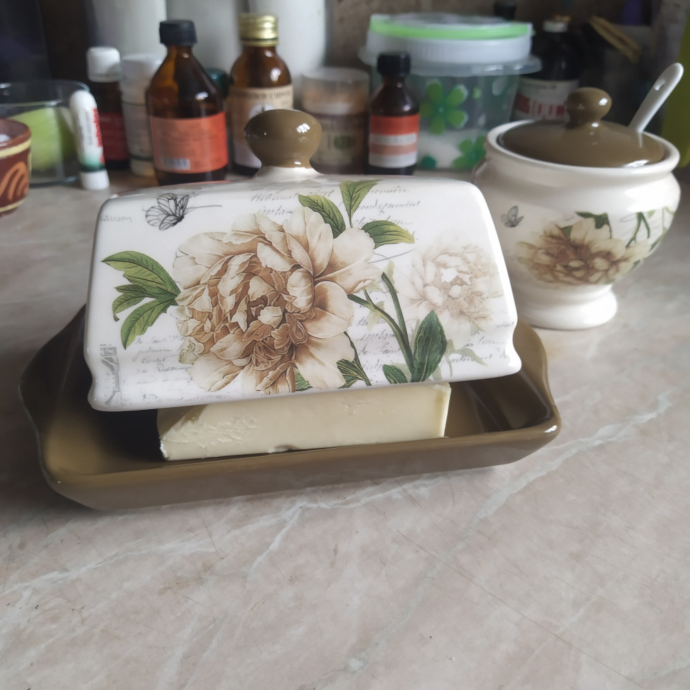 Заказывала маслёнку и сахарницу с ложкой, маслёнка хорошая, но внутренняя часть крышки сделана не удобно, обычная пачка масла 180гр. не накроется крышкой, подойдёт для масла, которое продают по 0,5кг и более, где форму куска масла можно отрезать по крышке. В чём не удобство крышки на фото видно. Сахарница маленькая, но миленькая.