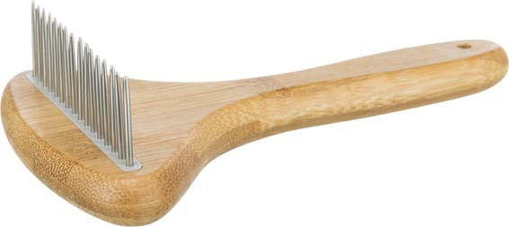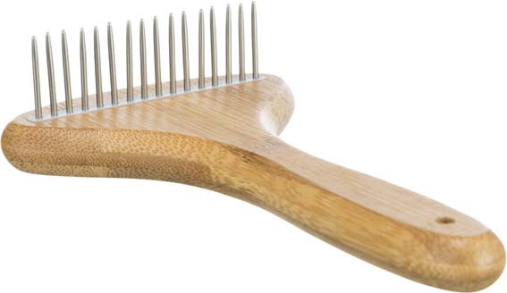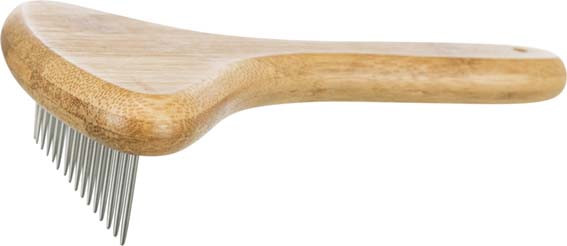 Корпус выполнен из натурального бамбука, что обеспечивает прочность и легкость аксессуару. Зубья скребницы редкие и имеют обработанные гладкие концы. Круглая форма зубчиков и вращающаяся конструкция при расчесывании шерсти не выдергивает волоски, даже если шерсть спутана. |