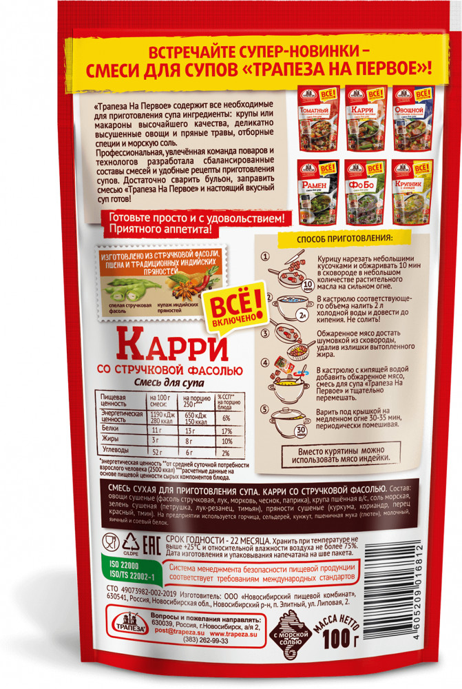 💳 Оплатить за товар можно при получении 🇰🇿 Есть бесплатная доставка по Казахстану 🎁 Копите бонусы с каждой покупки Серия: На Первое Смесь сухая для приготовления супа «Карри со стручковой фасолью». |