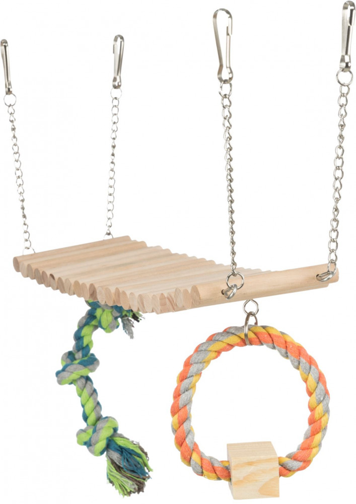 Trixie Мостик для хомяков подвеснойВ данный момент этот товар отсутствует в продаже. Возможно, у нас найдется аналогичный или похожий товар здесь. Подвесной деревянный мостик для клетки с мелкими грызунами — декоративными мышами или хомячками. Позволяет питомцу не скучать, поддерживая отличную физическую форму. Дополнительно аксессуар оснащен веревочным кольцом с деревянной игрушкой и канатом с узлами, чтобы разнообразить быт грызуна. Подвешивается такой мостик металлическим цепочками под потолок клетки и надежно фиксируется металлическими карабинами. |