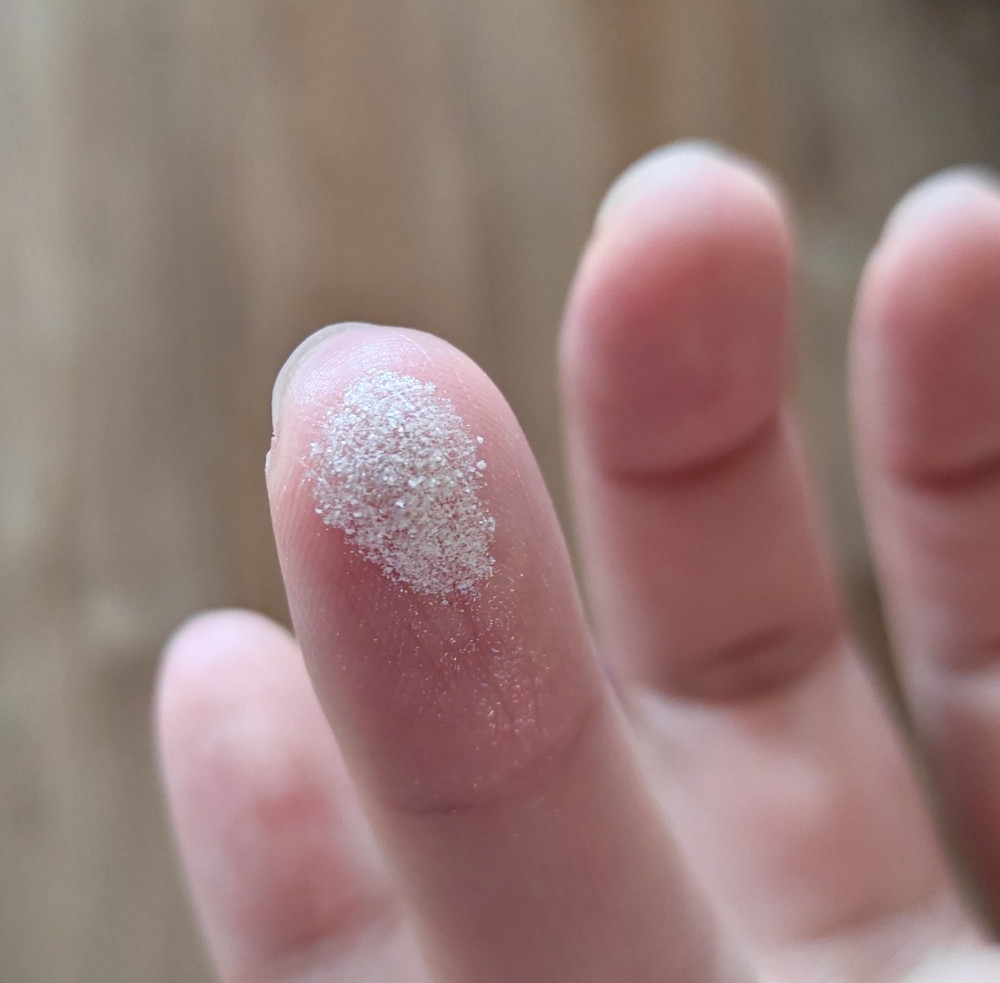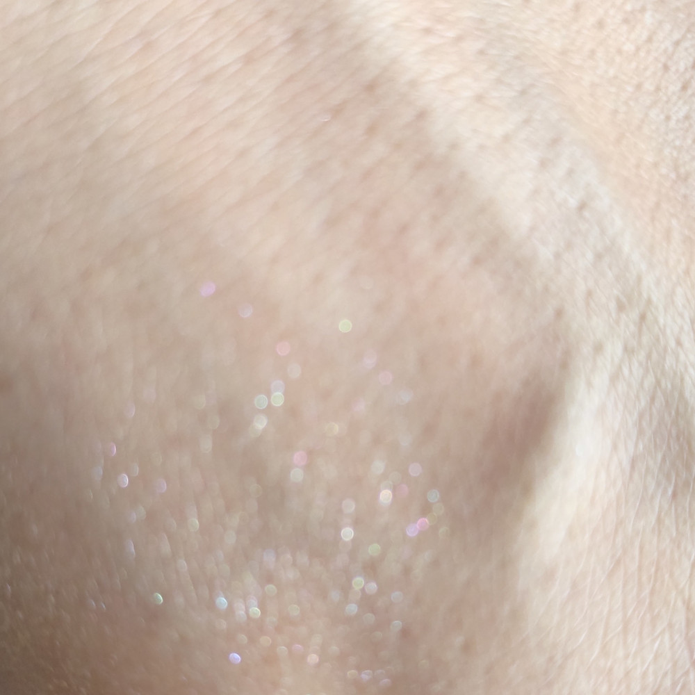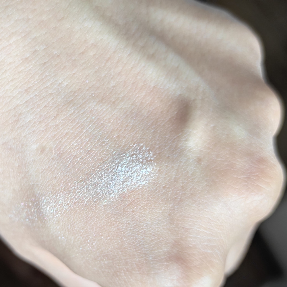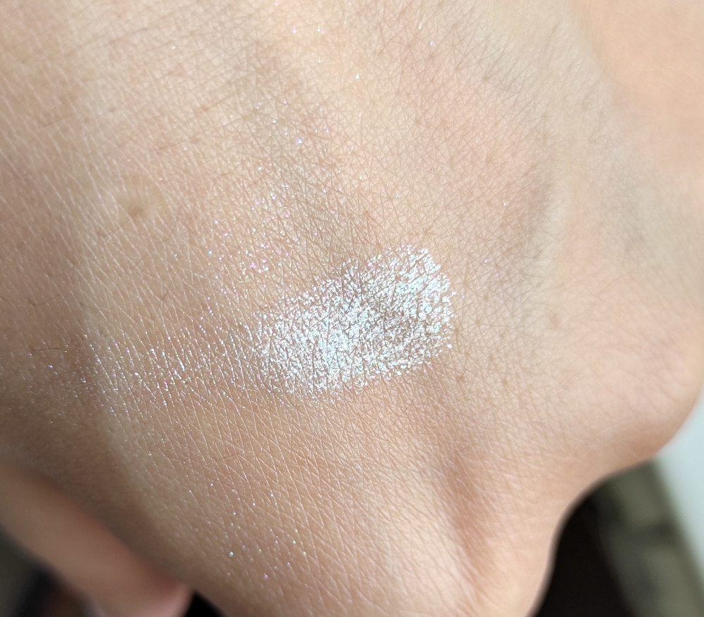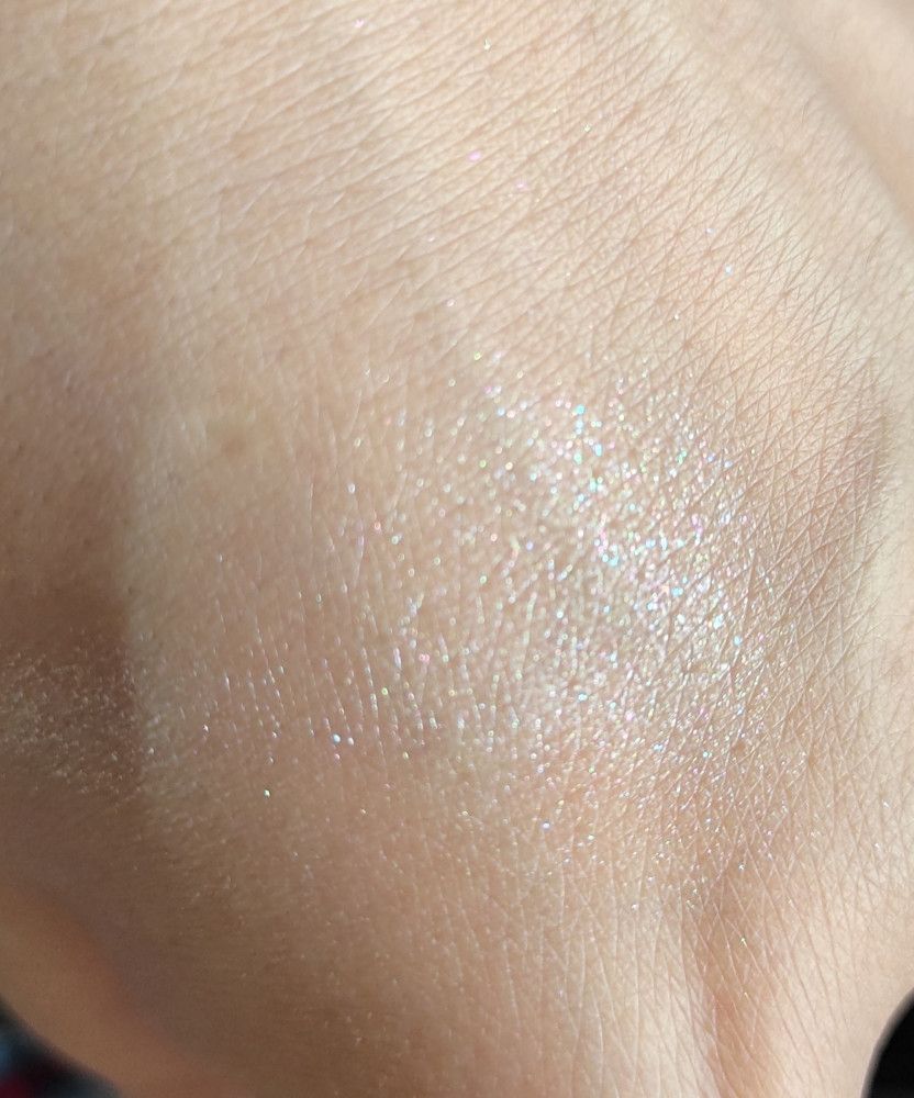 Интересный продукт. Немного напоминает мультихром. Набирается (на палец) слегка рыхло, но раскрывается красиво. Текстура немного маслянистая (похоже на то). Отлично подойдёт в качестве акцента в уголок глаза и на подвижное веко либо поверх смоки. Оттенок 01 Snow. Кстати,в качестве хайлайтера/иллюминайзера использовать бы не стала. Чересчур блестяще и аляписто. На прозрачной подложке розовые, зеленые и голубые блёстки. В расфокусе видно.