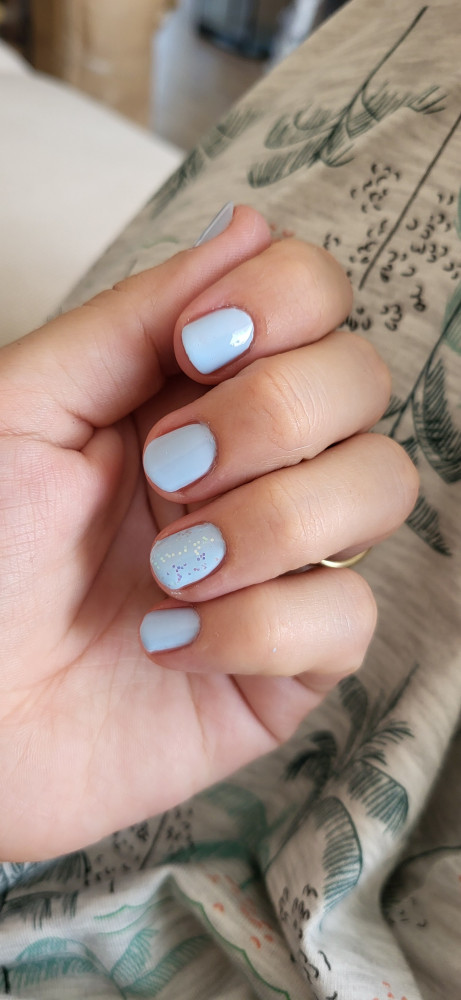 Нежный лавандовый цвет,хорошо продержался неделю при активной домашней работе