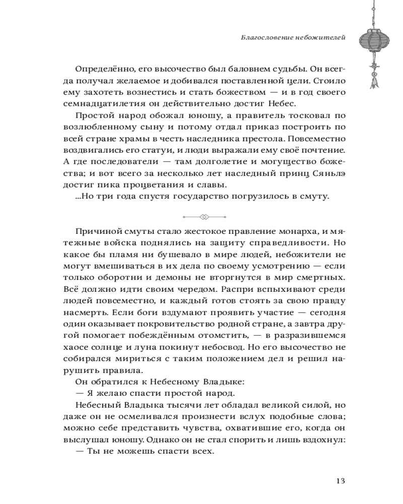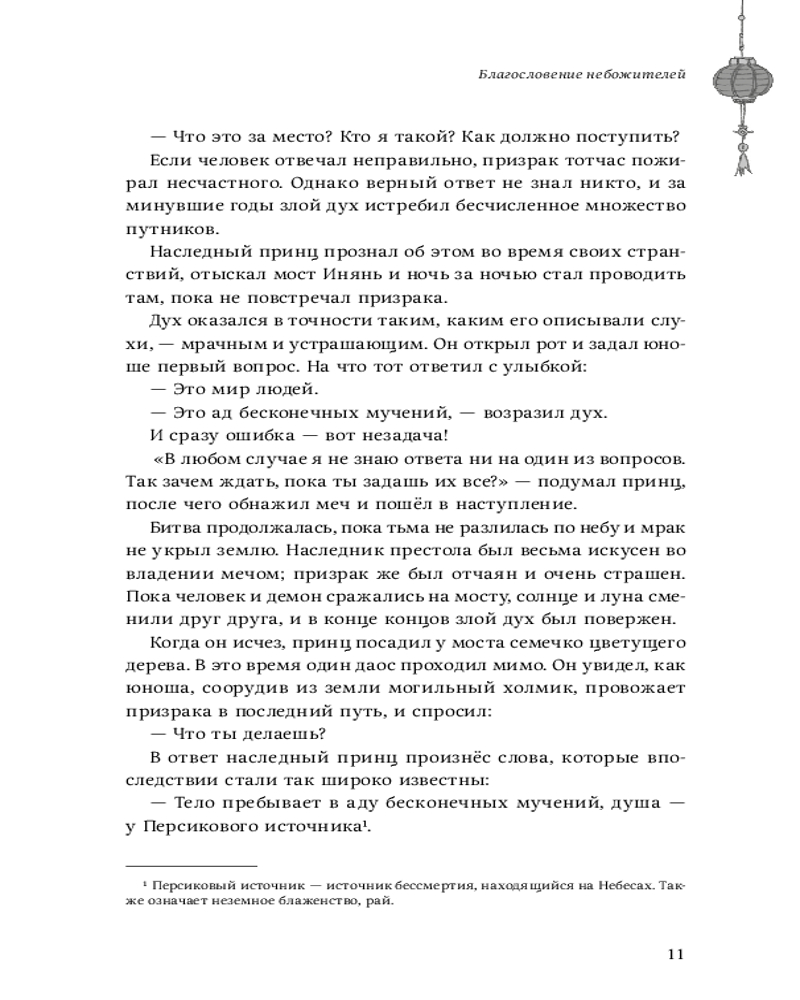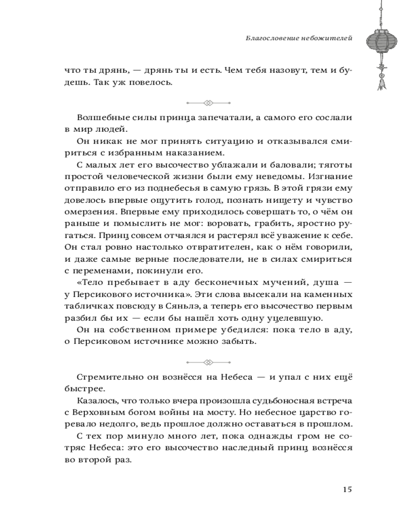 Романтическая и дружно южная история о божествах, один из которых Се Лянь третий раз вознесся и с этого начинается повествование. Потрясающее диалоги и развитие событие где я поначалу не понимал а уже потом сидел в 3 часа ночи в неотвлекаясь от чтении сижу и не могу понять где я кто я и только вижу как молю себя купить вторую часть. Это та самая книга которая мне просто принесла такую гору счастье грусти ненависти а одному а милости к другому. Эмоция от ураааа переходить что это за херня. Люди которые смотрят дорама понимают меня наверное.