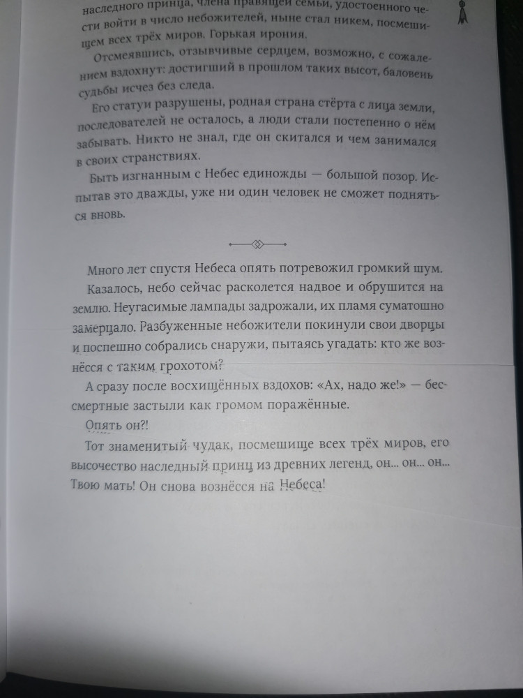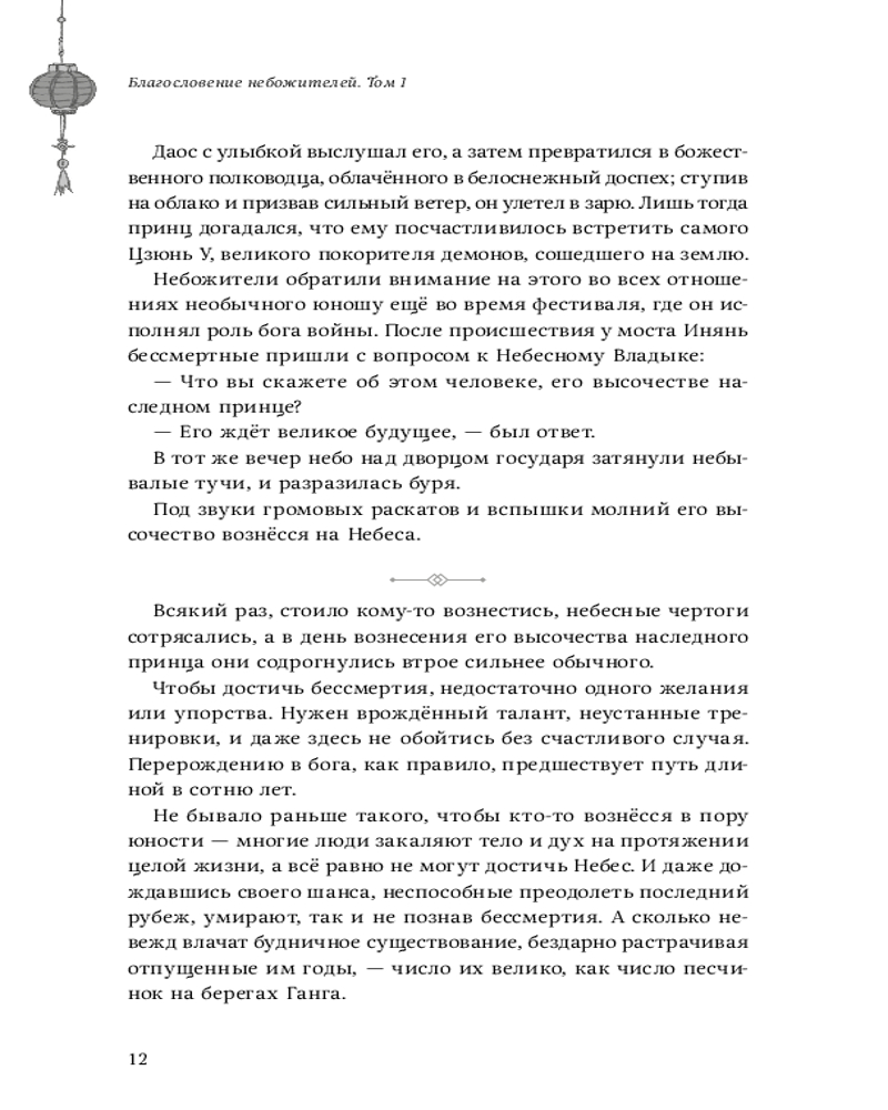 Если сравнивать "Небожителей" и "Основателя тёмного пути" то, мне всё таки ближе второй. Купила один том и решила, что остальные тома буду читать всё же в интернете. Так как цензура это раз (считаю что книга должна оставаться такой, какой написал её автор) и два это рисунки художника... Для детской книги они бы подошли или для юмористического журнала, но только не для данной книги, где довольно много драмы. Остаётся надеяться на то, что книгу переиздадут уже у нас в Казахстане, без цензуры и с нормальными рисунками.