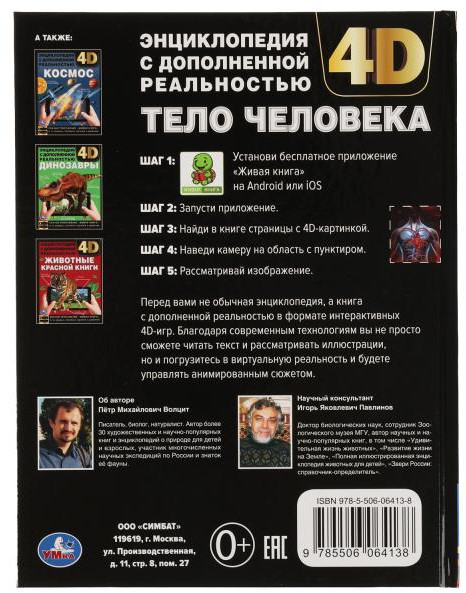 Эта занимательная энциклопедия расскажет юному читателю о том, как устроено наше тело, как функционирует наш организм и какие функции выполняет. Для большей наглядности книга оснащена технологией дополненной реальности, для её работы необходимо установить специальное приложение. При наведении камеры телефона на отмеченную пунктиром область страницы читатель погрузится в виртуальную реальность и сможет управлять анимированным сюжетом. Такой способ подачи материала в совокупности с яркими иллюстрациями и удивительными фактами увлечёт ребёнка и поможет ему быстро, эффективно и с удовольствием усвоить новую информацию.