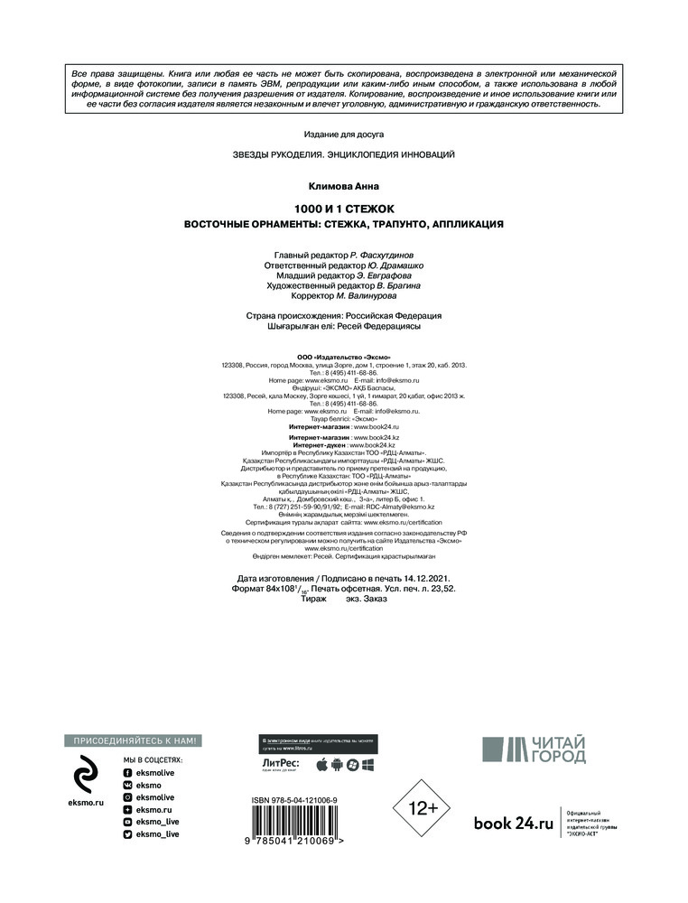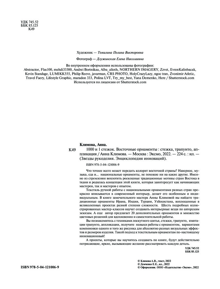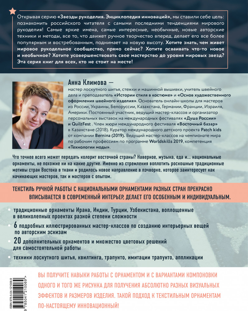 1000 и 1 стежок. Восточные орнаменты. Стежка, трапунто, аппликацияВ данный момент этот товар отсутствует в продаже. Возможно, у нас найдется аналогичный или похожий товар здесь. Серия: Звезды рукоделия. Энциклопедия инноваций Что точнее всего может передать колорит восточной страны? Наверное, музыка, еда и... национальные орнаменты, не похожие ни на какие другие. Именно из стремления воплотить роскошные традиционные мотивы стран Востока в ткани и родилась концепция этой книги, которая заинтересует как начинающих мастеров, так и мастеров с опытом. Текстиль ручной работы с национальными орнаментами разных стран прекрасно вписывается в современный интерьер, делает его особенным и индивидуальным. |