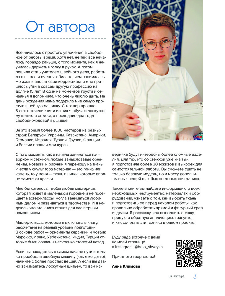 Книга на 3 из 10 не стоит своих денег! Может быть только поклонникам орнаментов и понравится, для новичков совсем не подойдёт... Есть QR codes для скачивания полноразмерной выкройки. Лично не по моему вкусу. Автор не популярный чел. Самый красивый из всех это орнамент Агра, да и то как идея, проекты не интересные, оформление пойдет, объяснение своеобразное... Вообщем все так себе...