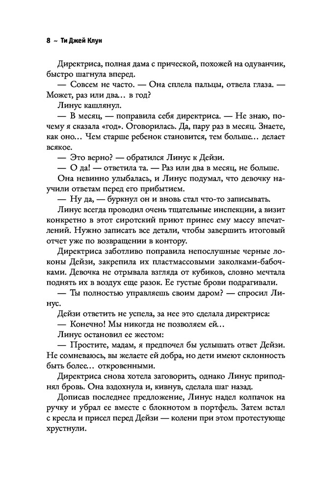 К качеству книги и доставке никаких претензий. Красивая обложка, качественные листы. Заказ пришел даже раньше срока. Но в книге откровенное гейство. Извиняюсь если кого обидела, но следить, как полнеющий и лысеющий 40 летний инспектор влюбляется в 45 летнего директора приют... ммм что? Да и идея с приютами для необычных детей не нова. Есть замечательная серия книг "Дом странных детей".