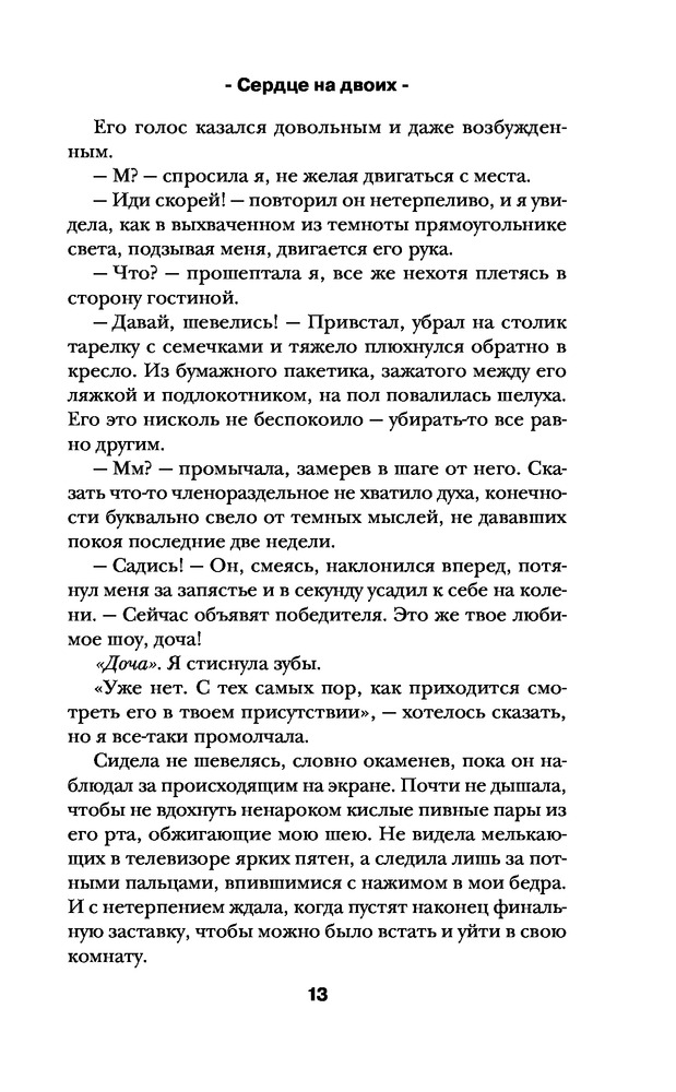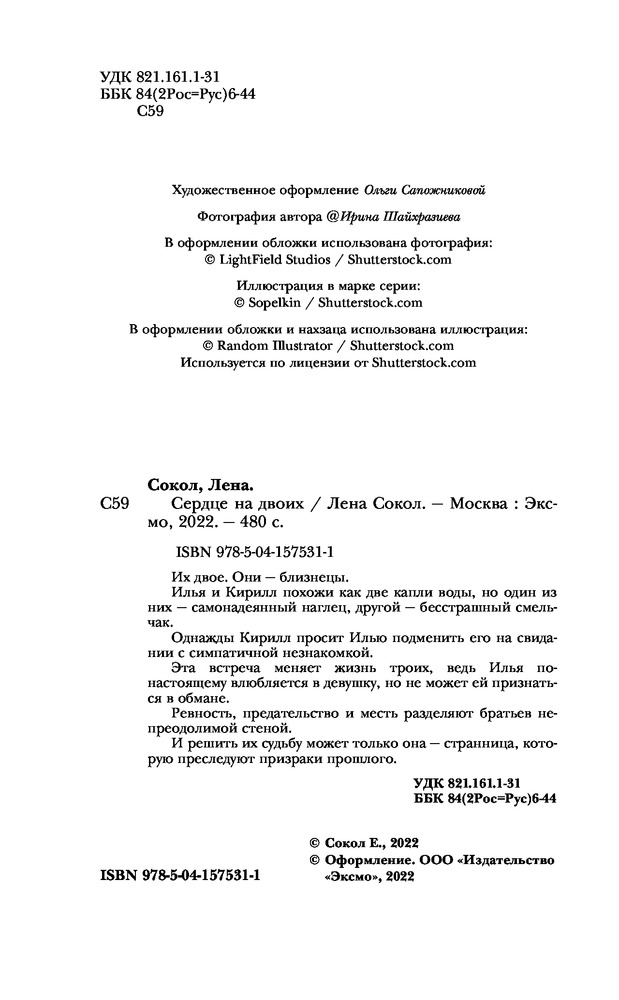 Сердце на двоихВ данный момент этот товар отсутствует в продаже. Возможно, у нас найдется аналогичный или похожий товар здесь. Серия: Романтика Лены Сокол Их двое. Они — близнецы. Илья и Кирилл похожи как две капли воды, но один из них — самонадеянный наглец, другой — бесстрашный смельчак.Однажды Кирилл просит Илью подменить его на свидании с симпатичной незнакомкой. Эта встреча меняет жизнь троих, ведь Илья по-настоящему влюбляется в девушку, но не может ей признаться в обмане.Ревность, предательство и месть разделяют братьев непреодолимой стеной. И решить их судьбу может только она ‒ странница, которую преследуют призраки прошлого. |