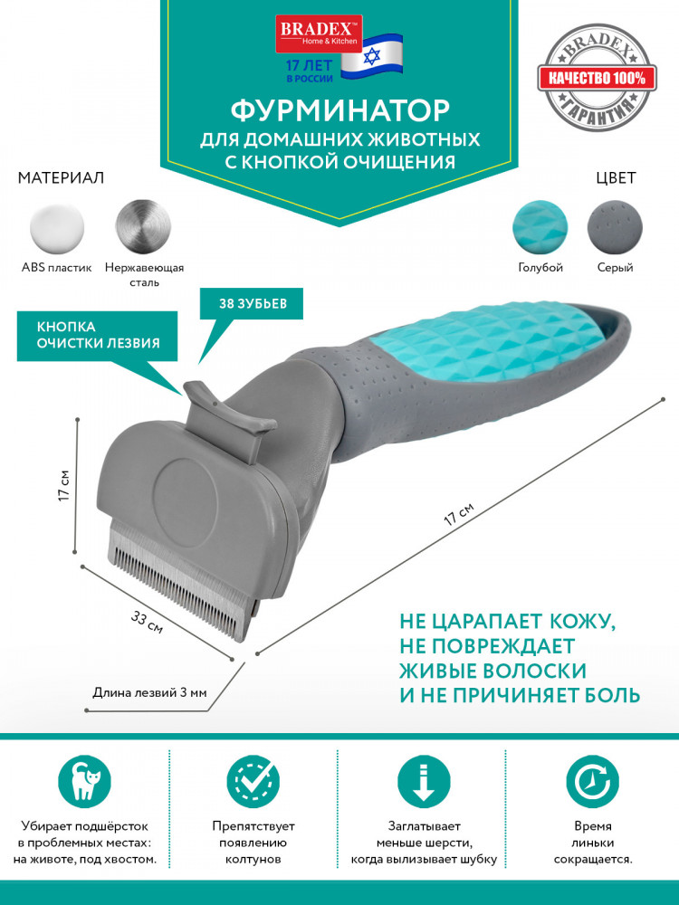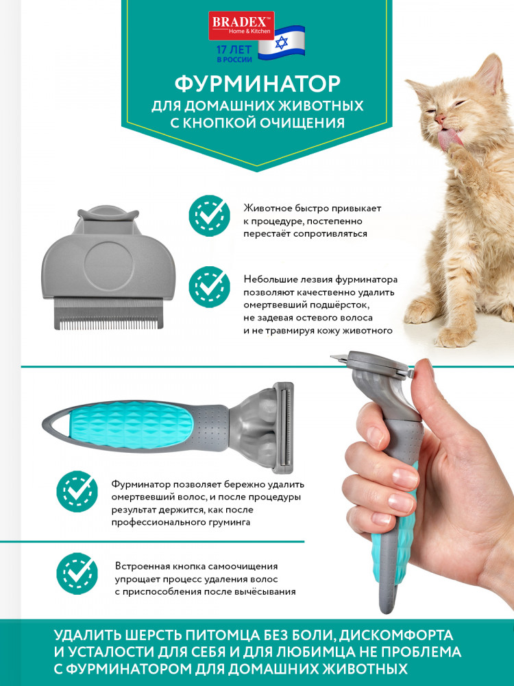 Bradex Фурминатор для кошек и собакВ данный момент этот товар отсутствует в продаже. Возможно, у нас найдется аналогичный или похожий товар здесь. Удалить шерсть питомца без боли, дискомфорта и усталости для себя и для любимца не проблема с фурминатором для домашних животных с кнопкой очищения. Небольшие лезвия фурминатора позволяют качественно удалить омертвевший подшёрсток, не задевая остевого волоса и не травмируя кожу животного. Фурминатор позволяет бережно удалить омертвевший волос, и после процедуры результат держится, как после профессионального груминга. Встроенная кнопка самоочищения упрощает процесс удаления волос с приспособления после вычёсывания. |