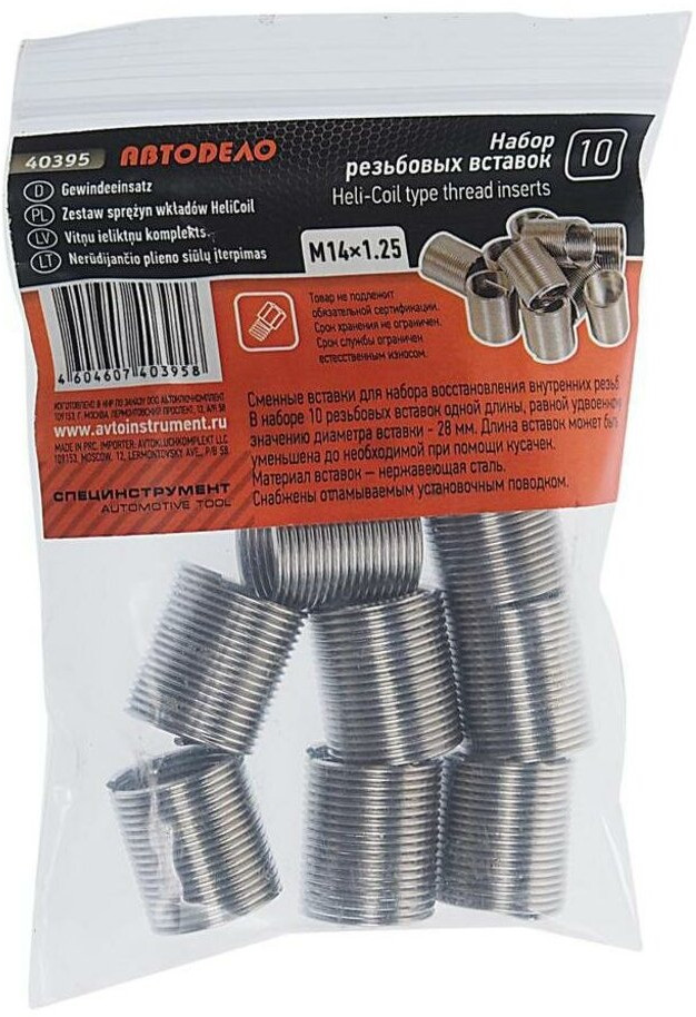 Часто случается так что резьбовые соединения приходят в негодность и требуется их дорогостоящий ремонт. Для того чтобы избежать больших расходов, мы рекомендуем воспользоваться специальными вставками, которые позволяют восстановить необходимую геометрию резьбы. Набор резьбовых вставок Автодело применяется везде где требуется быстрое восстановление поврежденной резьбы без замены узлов и механизмов. Предназначен для восстановления внутренней резьбы. Набор состоит из десяти пружинных резьбовых вставок, изготовленных из нержавеющей стали. Резьбовые вставки в наборе одной длины — равной удвоенному значению внутреннего диаметра. Резьбовые вставки могут быть укорочены до необходимой высоты путём откусывания кусачками лишних витков.