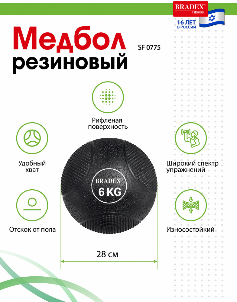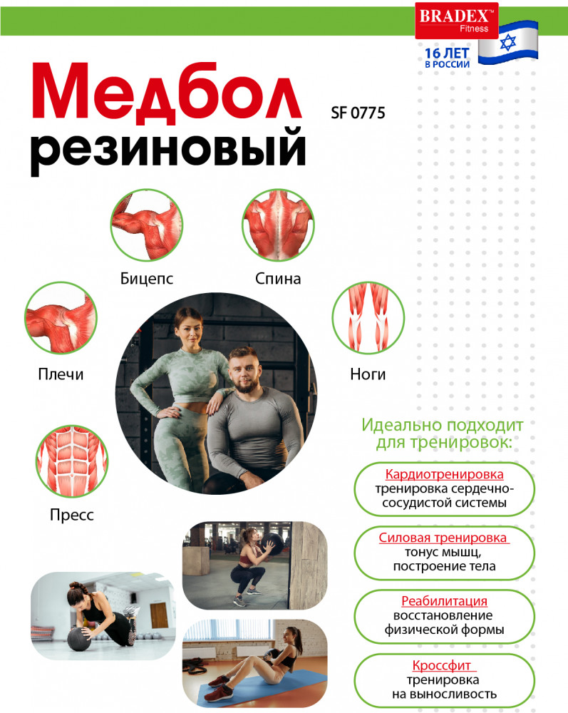 Медбол от «Bradex» - это спортивный снаряд-утяжелитель, предназначенный для кардио тренировок, функционального тренинга, кроссфита, групповых программ и единоборств. Упражнения с мячом позволяют в короткие сроки укрепить мышцы ягодиц, спины, рук, пресса и в целом сформировать рельефное подтянутое тело. Помимо основных мышц, медбол активно задействует мышцы-стабилизаторы. Выполненный из резины, мяч обеспечивает хороший отскок - соответственно, к базовым упражнениям с медболом можно подключить весь спектр упражнений на отскок (кроссфит и функциональный тренинг). Рифленая поверхность позволяет надежно зафиксировать мяч в руках. Медбол выполнен из высококачественных материалов и рассчитан на длительное использование.