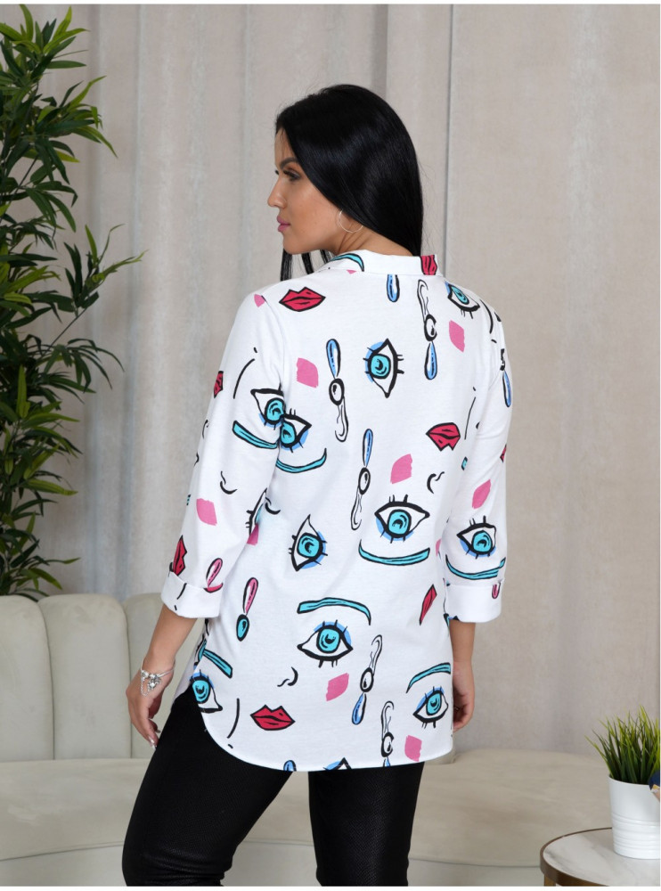 Рубашка очень понравилась. Приобрела белого цвета, свой размер 52. По сути идёт размер в размер, даже немного свободно. Тонкий, мягкий трикотаж,. практически не мнётся. По крайней мере после стирки встряхнула, высохла, надела и пошла, никаких складок, заломов. Единственное, пуговки еле еле держались и после стирки три пуговицы пришлось пришивать. Немного подсела после стирки, но она длинная, на мой рост 160, так что не критично. Хорошо смотрится с легинсами, лосинами, бриджами. В жаркую погоду можно носить, ткань дышащая. Будет чуть прохладней надену под неё майку или топик. Рукав три четверти, но я подворачиваю пока жара. Брала дочери майку из такого же трикотажа, носит второй год и ничего ей не сделалось, не полиняла, не скаталась, не растянулась, сохранила презентабельный вид. Потому решила себе купить эту рубашку.