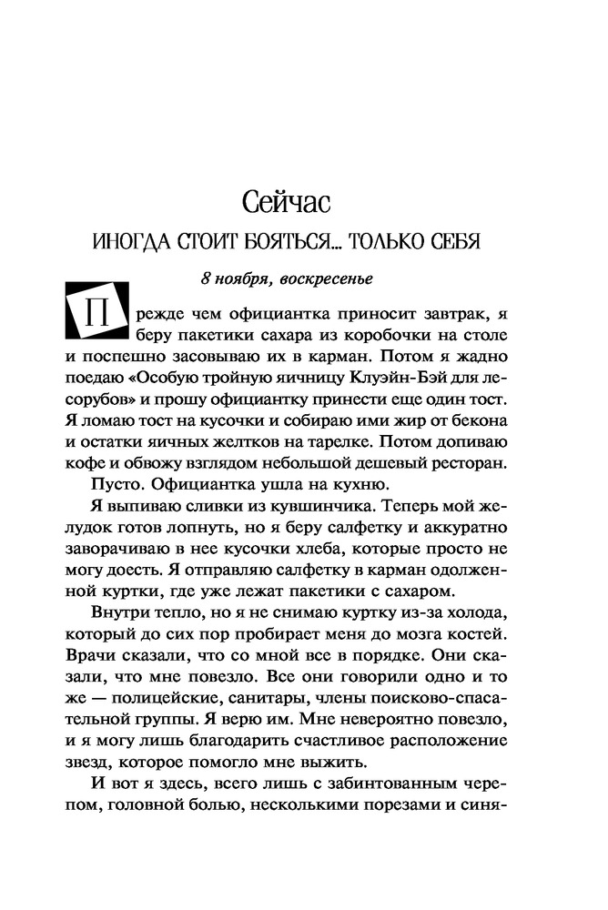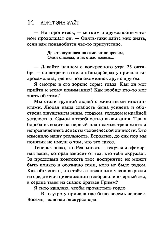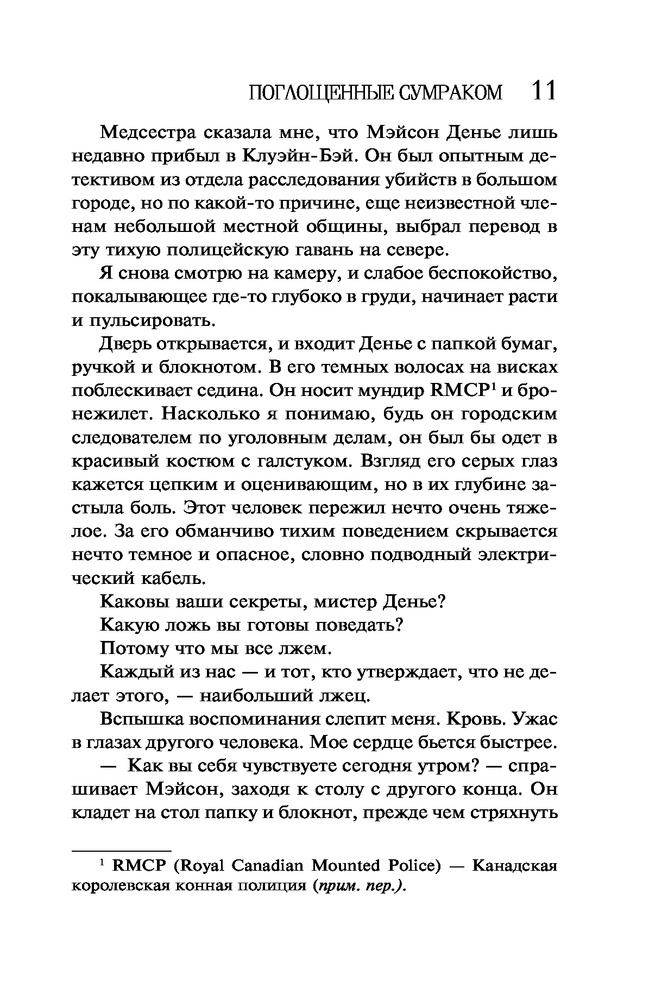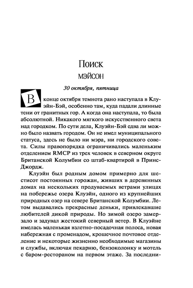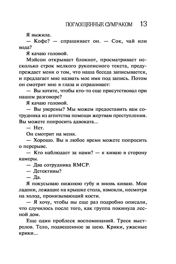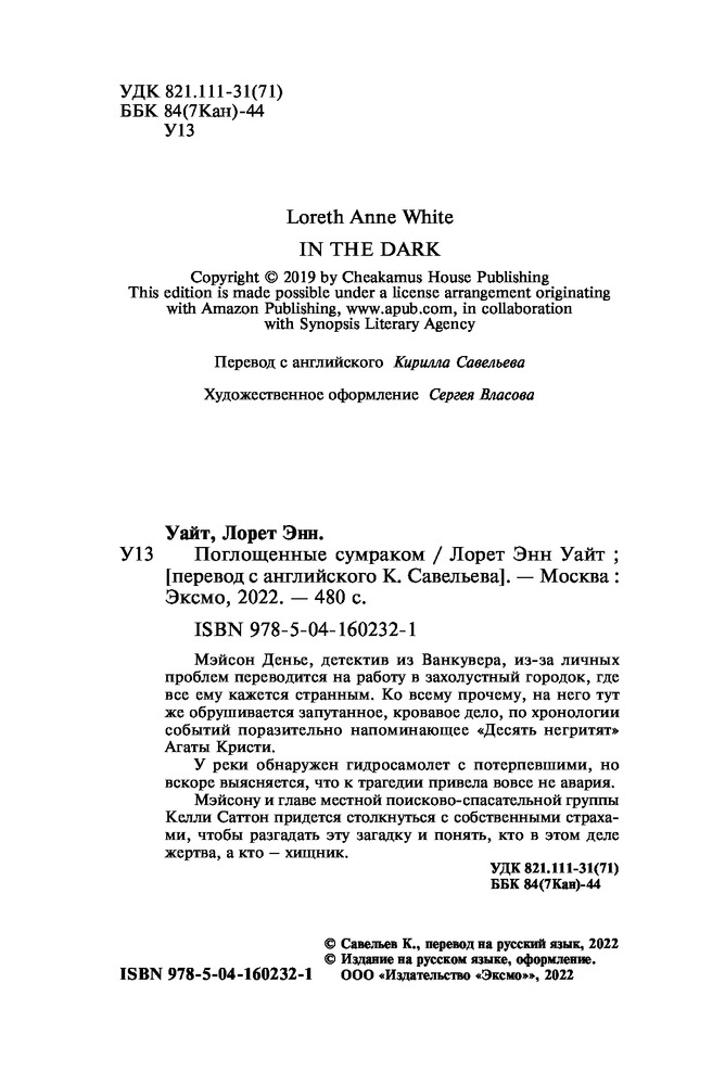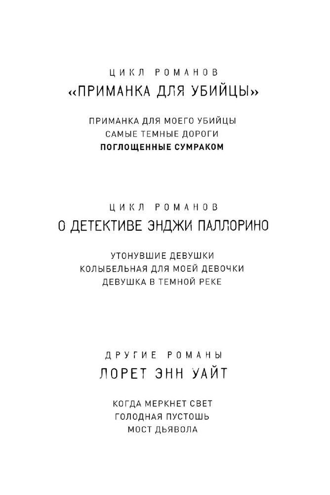 Поглощенные сумракомВ данный момент этот товар отсутствует в продаже. Возможно, у нас найдется аналогичный или похожий товар здесь. Серия: Высшая лига детектива. Романы Лорет Энн Уайт (обложка) Мэйсон Денье, детектив из Ванкувера, из-за личных проблем переводится на работу в захолустный городок, где все ему кажется странным. Ко всему прочему, на него тут же обрушивается запутанное, кровавое дело, по хронологии событий поразительно напоминающее «Десять негритят» Агаты Кристи. У реки обнаружен гидросамолет с потерпевшими, но вскоре выясняется, что к трагедии привела вовсе не авария. Мэйсону и главе местной поисково-спасательной группы Келли Саттон придется столкнуться с собственными страхами, чтобы разгадать эту загадку и понять, кто в этом деле жертва, а кто — хищник. |