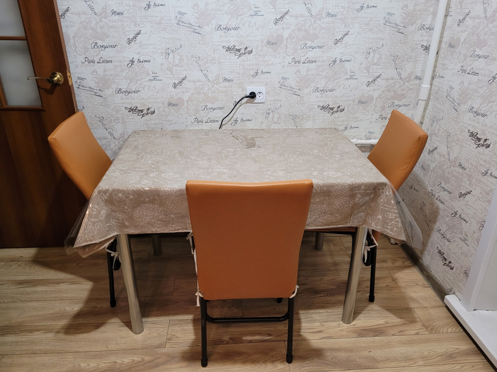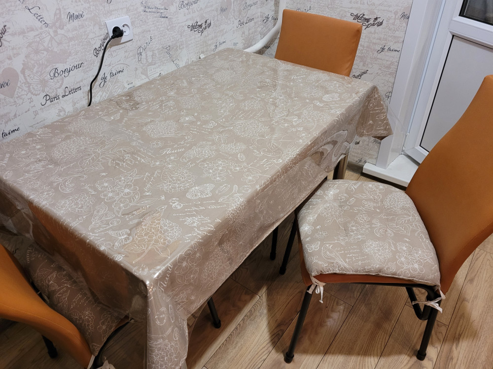 у меня комплект получился с подушками на стулья. Эстетично.