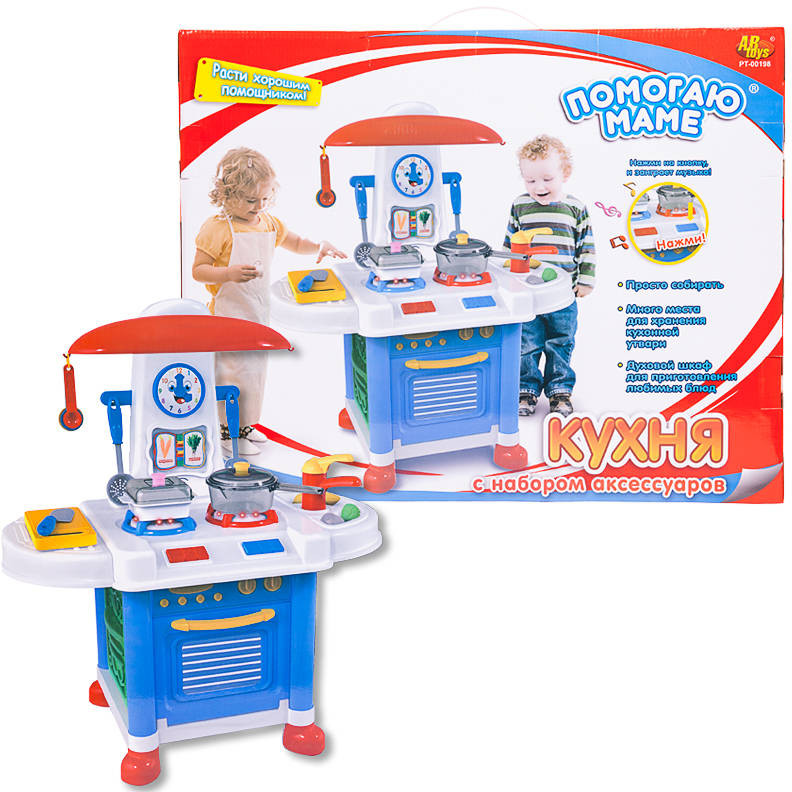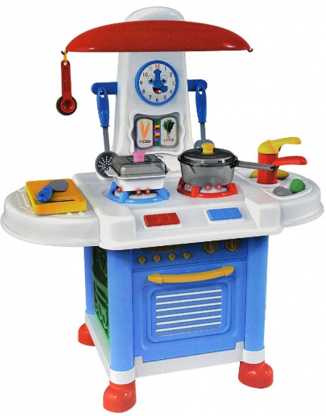 В набор входит разнообразная посуда (нож, разделочная доска, кастрюлька и т.д.), продукты, а также книга рецептов (под часами), которую можно листать. Кухня выполнена из высококачественной пластмассы, абсолютно безвредной для здоровья.