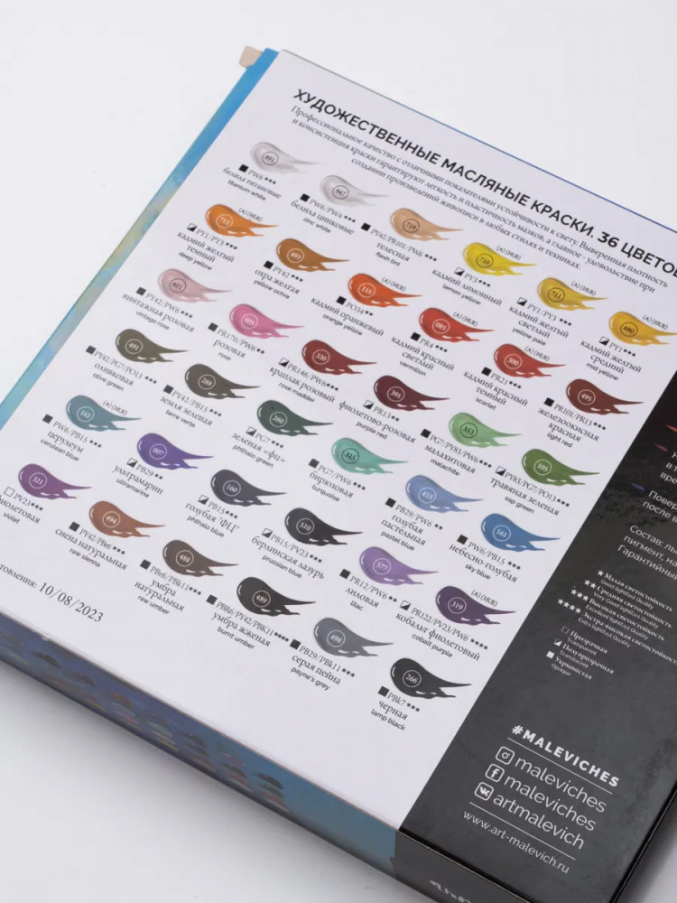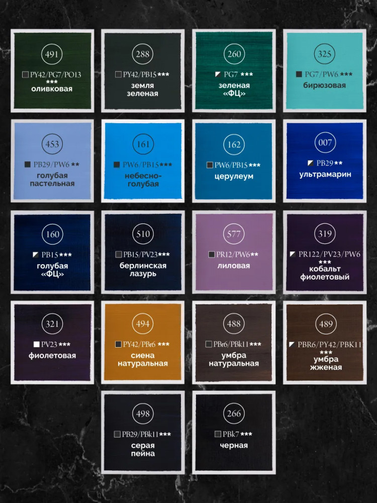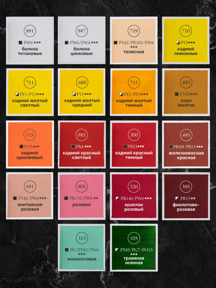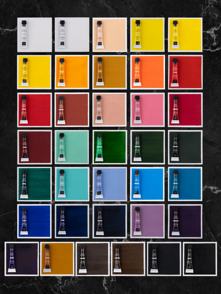 Состав набора: белила титановые, белила цинковые, телесная, кадмий лимонный, кадмий, желтый светлый, кадмий желтый средний, кадмий желтый темный, охра желтая, кадмий оранжевый, кадмий красный светлый, кадмий красный темный, железоокисная красная, винтажная розовая, розовая, краплак розовый, фиолетово-розовая, малахитовая, травяная зеленая, оливковая, земля зеленая, зеленая ФЦ, бирюзовая, голубая пастельная, небесно голубая, церулеум, голубая ФЦ, ультрамарин, берлинская лазурь, лиловая, кобальт фиолетовый, фиолетовая, сиена натуральная, умбра натуральная, умбра жженая, серая пейна, черная. |
