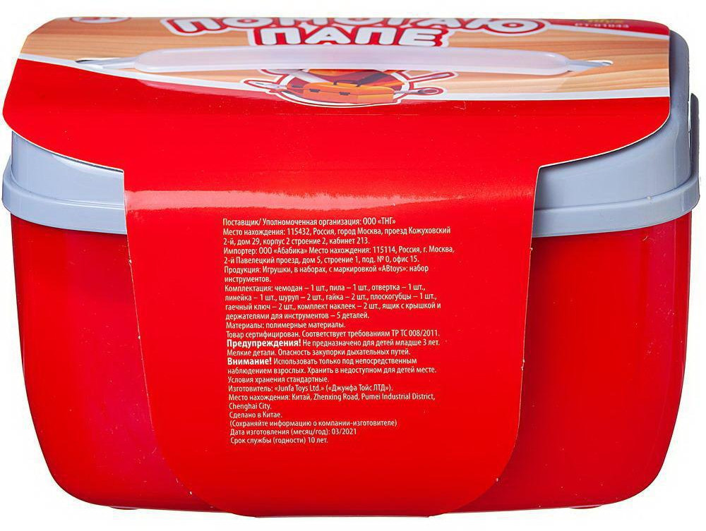 💳 Оплатить за товар можно при получении 🇰🇿 Есть бесплатная доставка по Казахстану от 1 дня 🎁 Копите бонусы с каждой покупки Серия: Помогаю папе Набор инструментов «Помогаю папе» содержит все необходимые инструменты, чтобы починить любую поломку и стать мастером на все руки! Все предметы набора сделаны из пластика и безопасны для игры. При этом, их внешний вид в точности повторяет внешний вид настоящих инструментов, так что на примере игрушек можно объяснить ребенку зачем нужен каждый инструмент и дать понять, как им пользоваться. Сам ящик с помощью дополнительных элементов, входящих в состав этого набора, трансформируется в мини-мастерскую. |