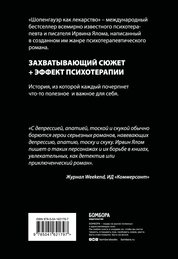 Шопенгауэр как лекарство. Психотерапевтические историихудожественное повествование психотерапевтическая тематика философская глубина эмоциональный финал интегральный переплет В данный момент этот товар отсутствует в продаже. Возможно, у нас найдется аналогичный или похожий товар здесь. Серия: Ирвин Ялом. Мировые бестселлеры (обложка) Опытный психотерапевт Джулиус узнает, что смертельно болен. Его дни сочтены, и в последний год жизни он решает исправить давнюю ошибку и вылечить пациента, с которым двадцать лет назад потерпел крах. Филип — философ по профессии и мизантроп по призванию — планирует заниматься «философским консультированием» и лечить людей философией Шопенгауэра — так, как вылечил когда-то себя. Эти двое сталкиваются в психотерапевтической группе и за год меняются до неузнаваемости. Один учится умирать. Другой учится жить. «Генеральная репетиция жизни», происходящая в группе, от жизни неотличима, столь же увлекательна и так же полна неожиданностей. |