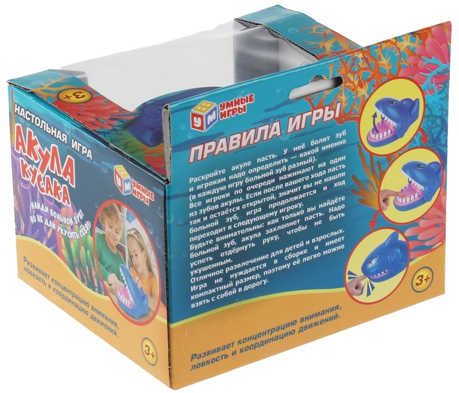 Умные игры Игра настольная «Акула-кусака»В данный момент этот товар отсутствует в продаже. Возможно, у нас найдется аналогичный или похожий товар здесь. Настольная игра «Акула-кусака» ТМ «Умные игры» — прекрасное развлечение для всей семьи. Эта занимательная игра позволит весело и динамично провести время. Цель игры — найти у акулы больной зуб, но при этом не дать себя укусить. Голова забавной акулы с открывающейся и неожиданно захлопывающейся пастью приведёт детей в полный восторг. Благодаря компактным размерам игру можно брать с собой в поездки. |