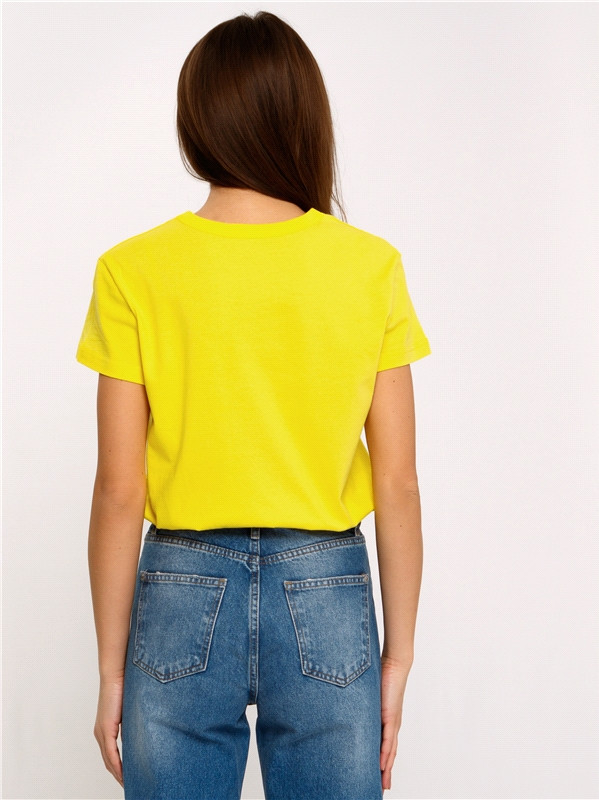 Футболка выполнена из легкого хлопкового полотна. Изделие свободного покроя с короткими рукавами и округлым вырезом горловины.
