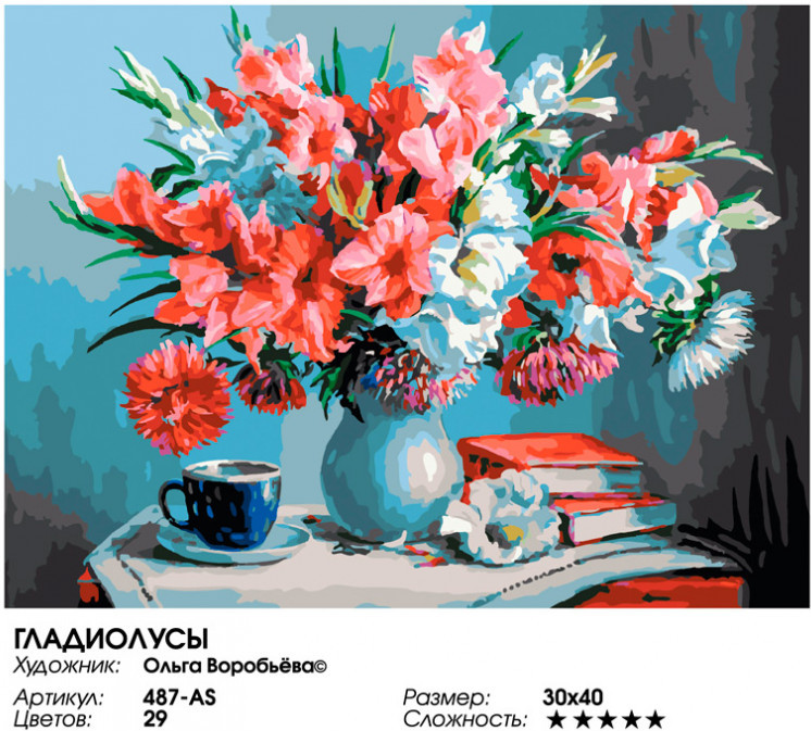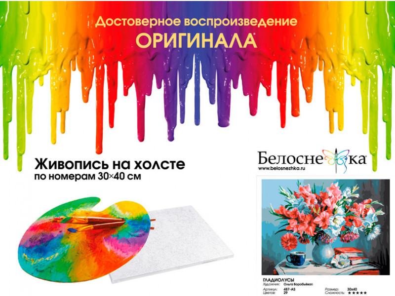 Внимание! Краски могут подсохнуть или быть слишком густыми — это не является браком, в этом случае добавьте небольшое количество воды и хорошо размешайте краску. Рекомендуем раскрашивать картину без длительных перерывов, чтобы краска в баночках не высыхала.