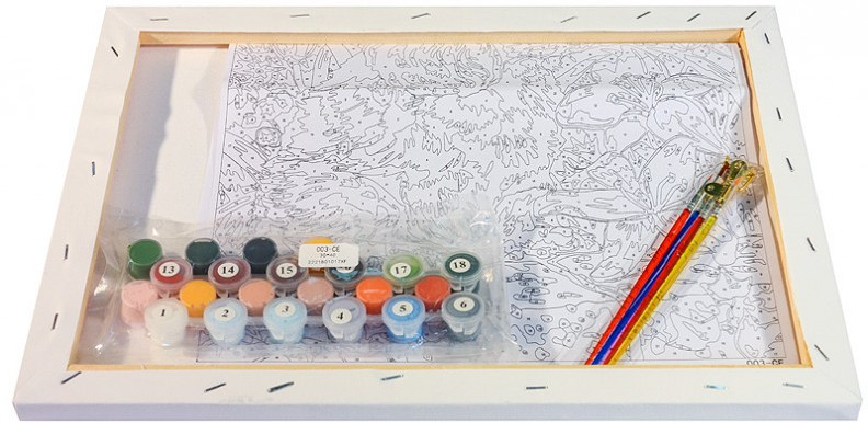 Серия: Животные, собачки В этом наборе вы найдете холст на подрамнике, на который нанесены контуры рисунка, а также числа, указывающие на цвет, которым должна быть закрашена та или иная часть картины. Наносите краску нужного цвета на холст при помощи кисти, сверяясь с контрольной схемой. Это спокойное, неторопливое занятие подойдет и ребенку, и взрослому, к тому же оно помогает развить цветовосприятие, аккуратность и художественный вкус. |