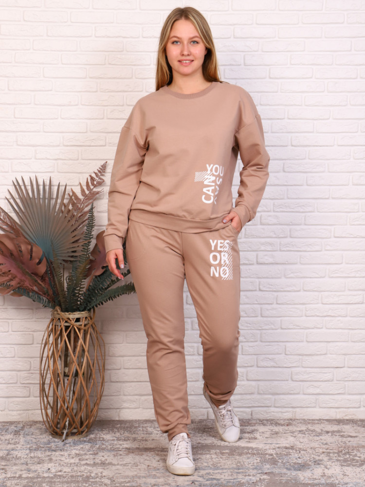 Костюм женский из футера 2х нитки, состоит из кофты и брюк. Кофта прямого силуэта. Горловина круглая обработана кашкарсе. Рукав длинный, втачной по низу манжет. На полочке принт. По низу изделия пояс. Брюки прямые, к низу зауженные, посадка средняя. Верх на поясе с резинкой. В боковых швах карманы, вход в карман обработан обтачкой. По низу брюк манжет. На передней половинке брюк принт.