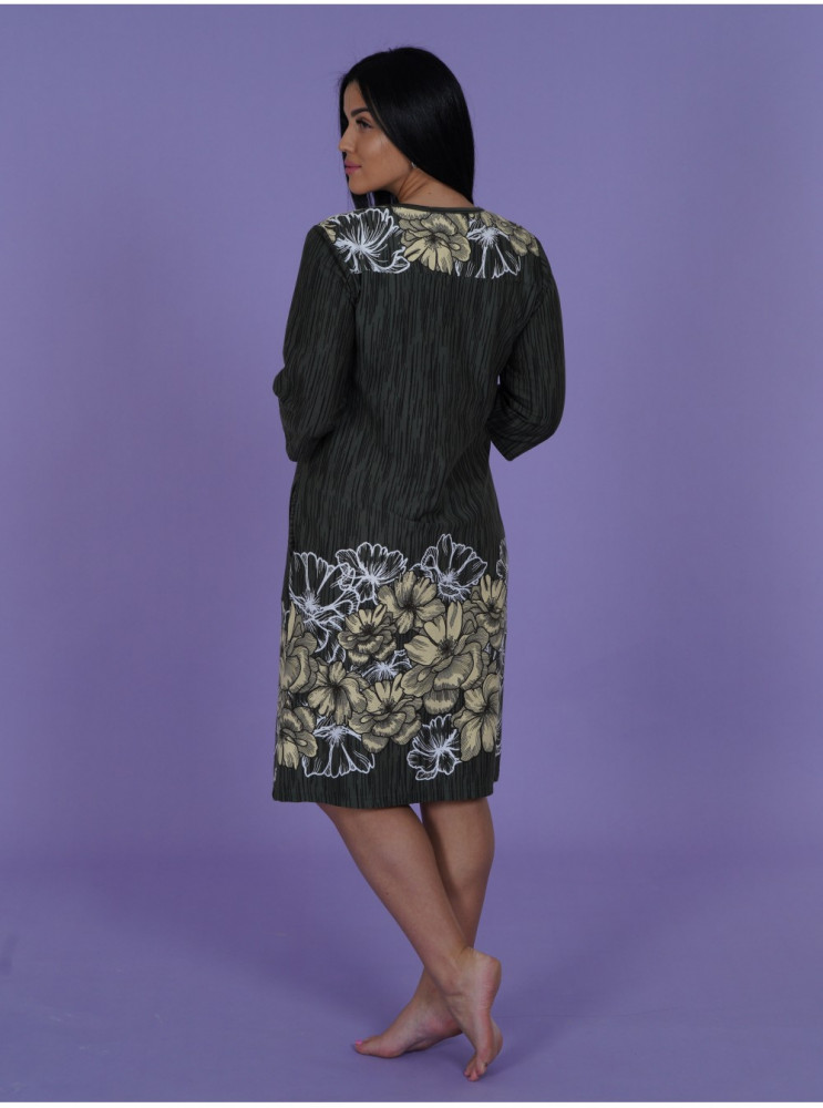 Халат хорош. Хотя и трикотаж, но тянется несильно. Цвет не коричневый, а серо-коричневый, причём ближе к серому, неяркий, неконтрастный. При моём росте 170 прикрывает колени. Рукава свободные, небольшие карманы.