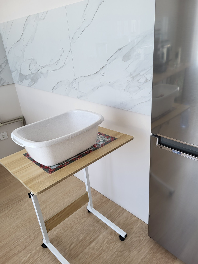Стол неплохой, достаточно вместительный, устойчивее, чем белый пластиковый и лучше вписывается в интерьер, поворотные колеса позволяют перемещать его в любом направлении.