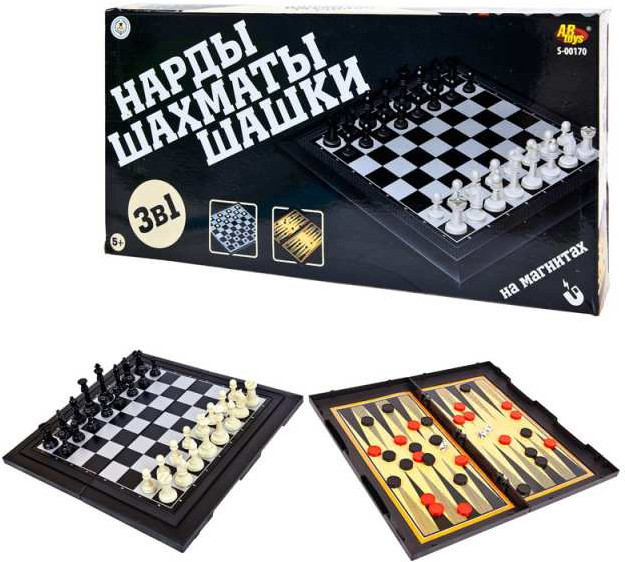 Данный набор включает две популярные настольные игры: шахматы, шашки и нарды. Выполнен из качественной пластмассы. Шахматные фигуры и фишки после игры удобно хранить внутри сложенного игрового поля, Набор плотно закрывается на встроенный защелкивающий замочек. Расположенные на магнитном поле фигуры, не сдвинуться со своих мест при механическом колебании доски