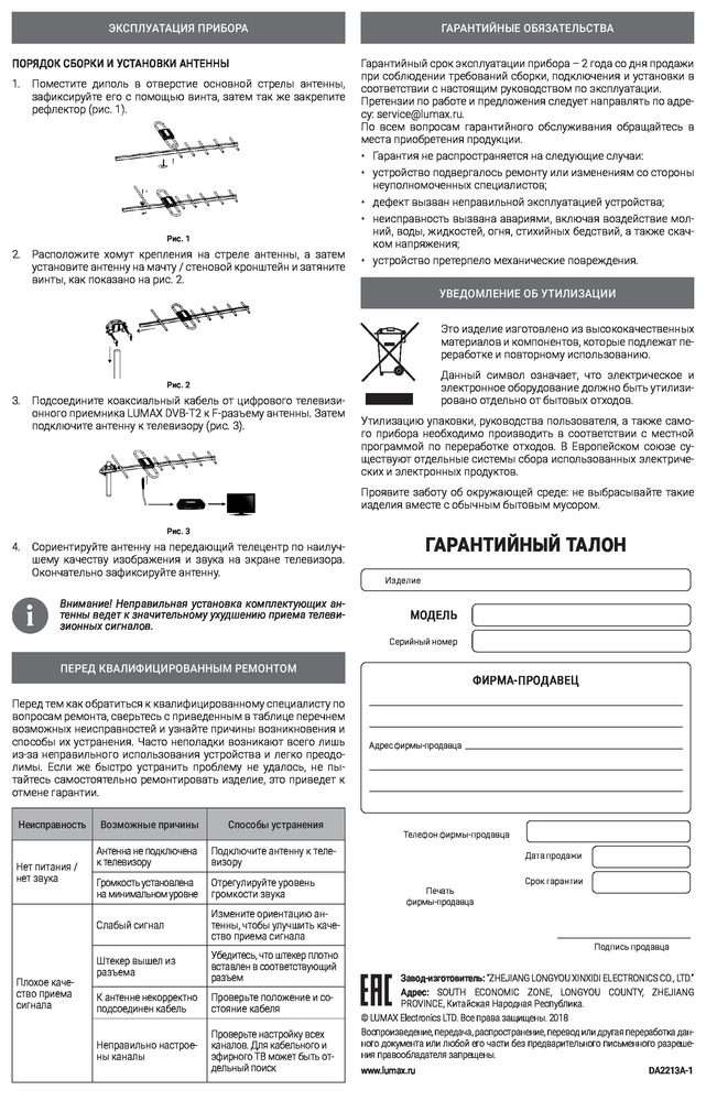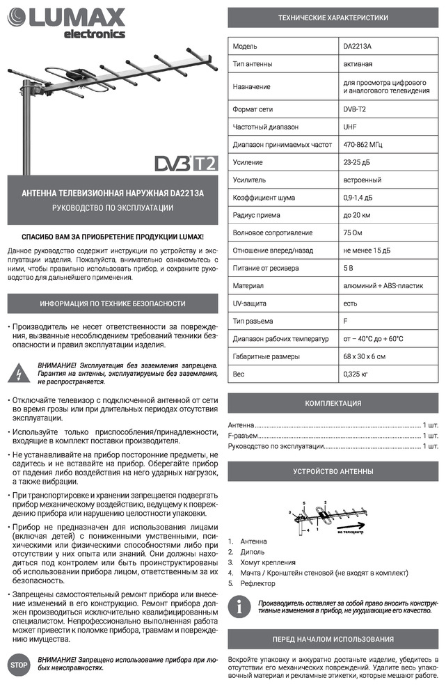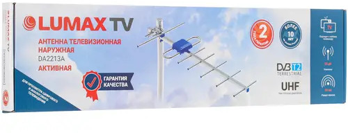 Lumax Антенна телевизионная наружная DA2213АВ данный момент этот товар отсутствует в продаже. Возможно, у нас найдется аналогичный или похожий товар здесь. Активная наружная телевизионная антенна Lumax DA2213A предназначена для просмотра цифрового и аналогового телевидения и совместима с любыми моделями телевизоров и цифровых телевизионных приемников стандарта DVB-Т2. Корпус устройства состоит из ABS-пластика и алюминия, за счет чего вес составляет всего 0,33 кг. Благодаря особой конструкции модель Lumax DA2213A имеет большую мощность, в отличие от комнатной антенны. Применяется на расстоянии до 20 км в прямой видимости от телецентра. В комплектацию входит F-разъем. Помните: нужно тем выше устанавливать антенну, чем дальше находится телецентр. После подключения антенны к телевизору для улучшения качества приема сигнала меняйте ее ориентацию и проверяйте настройку всех каналов. Достигнув идеального качества приема, тщательное закрепите устройство на крыше, стене или балконе своего дома. Примечательно, что данной модели не страшны никакие погодные условия, у нее невероятный температурный порог: от — 40 до + 60°С. |